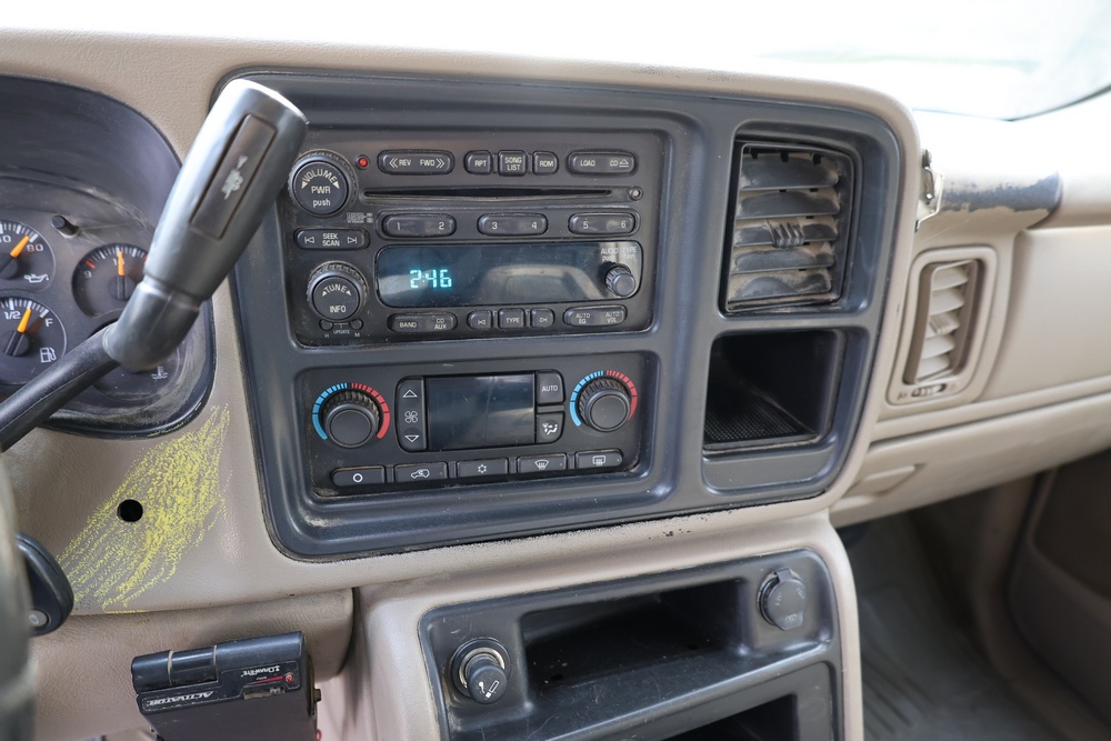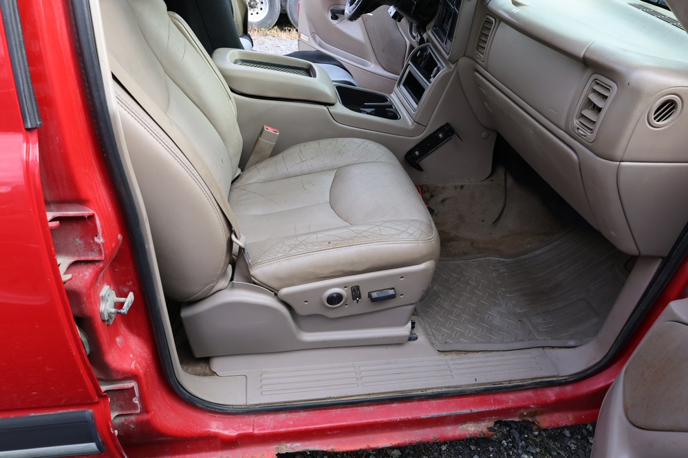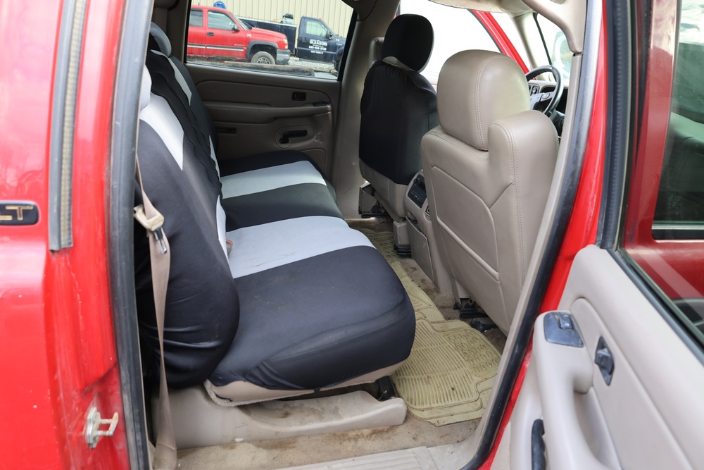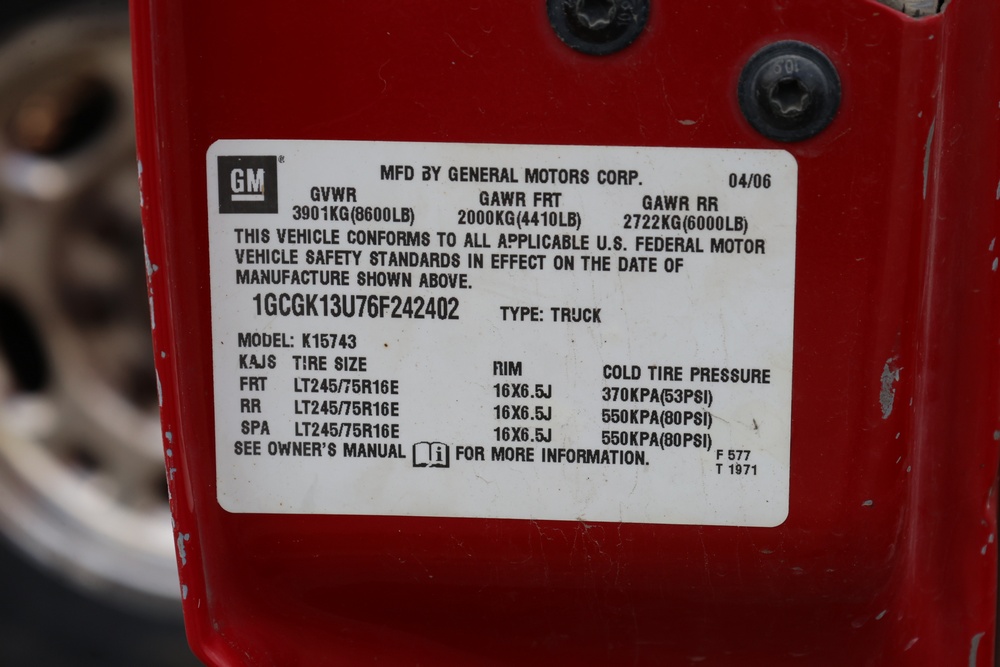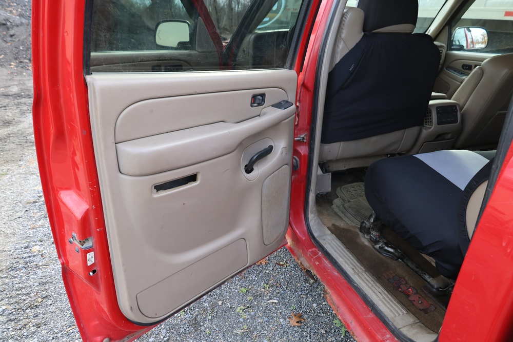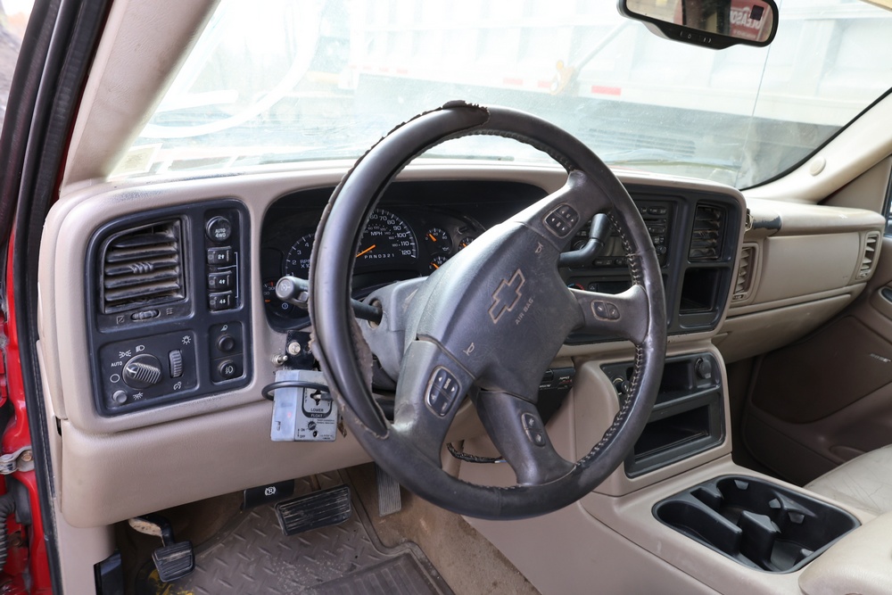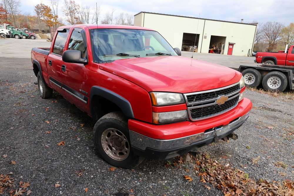 2006 Chevrolet Silverado 1500HD crew cab pickup truck with a Vortec 6.0L V8 engine, automatic transmission, and 4WD. VIN: 1GCGK13U76F242402. Odometer reading: 181,922 miles. Exterior: Red with four full-size doors, factory alloy wheels, and rear step bumper. Interior: Tan with front bucket seats and center console, factory stereo with CD and cassette player, power windows, locks, and mirrors. Additional features include dual-zone climate control, and plow mount. Runs and drives. Title and key available.