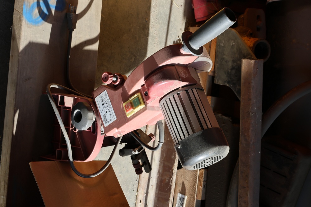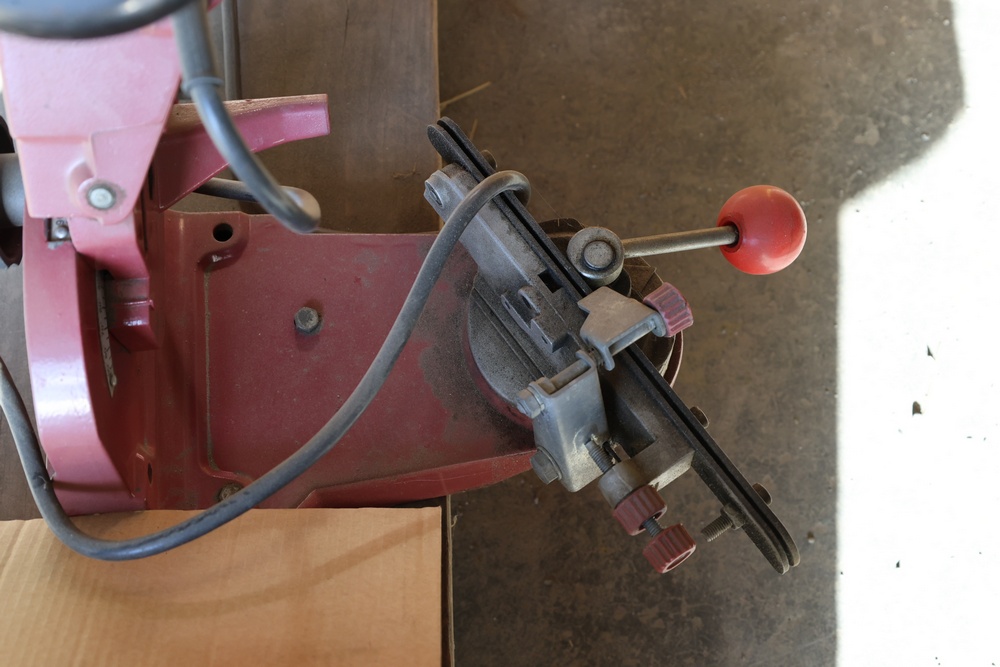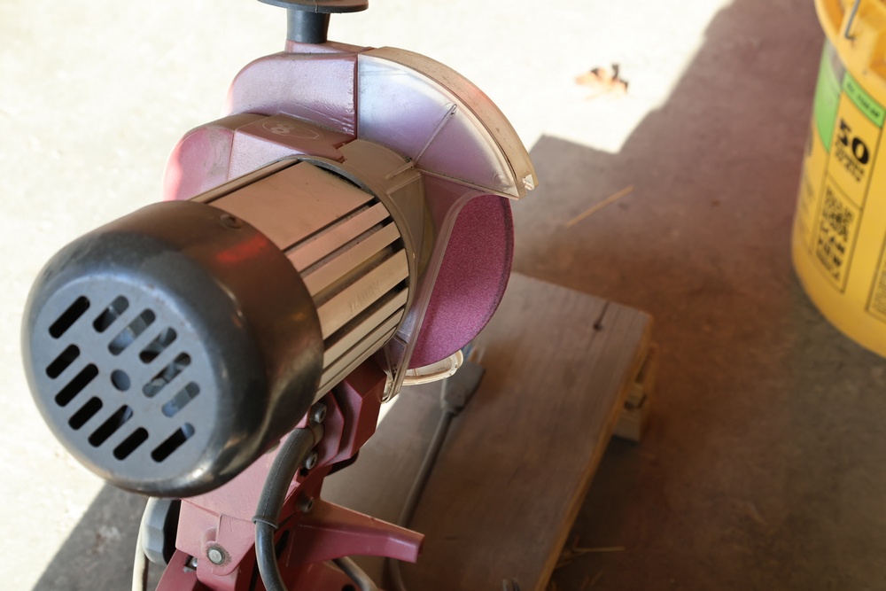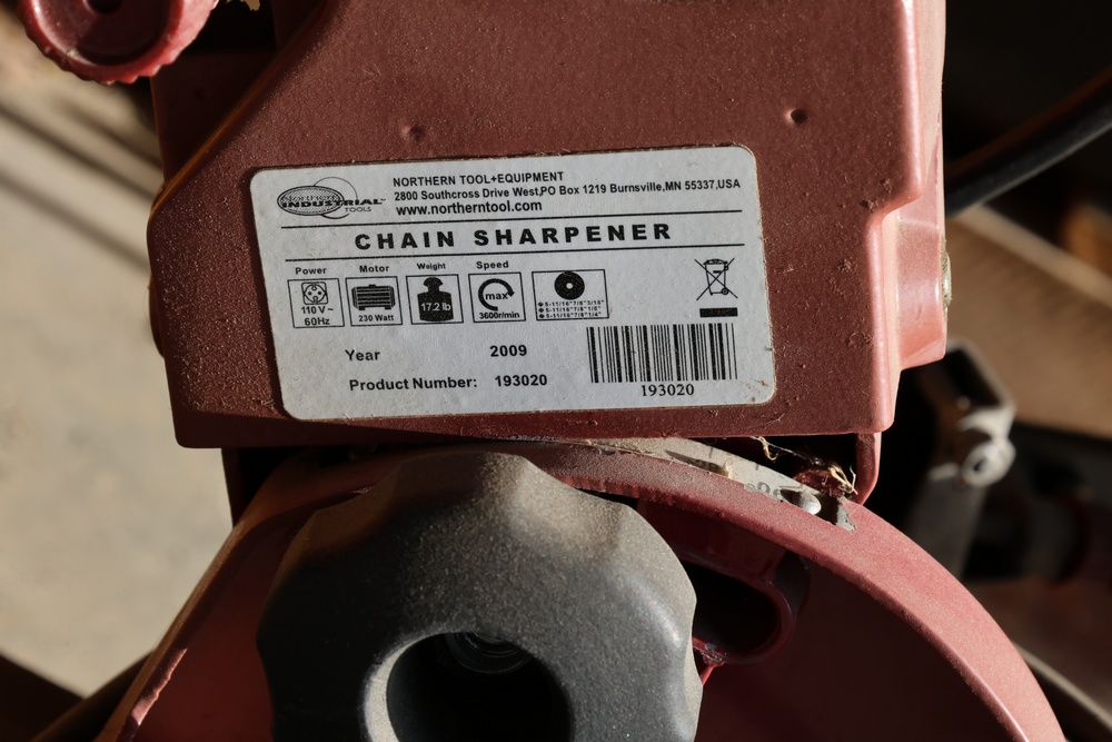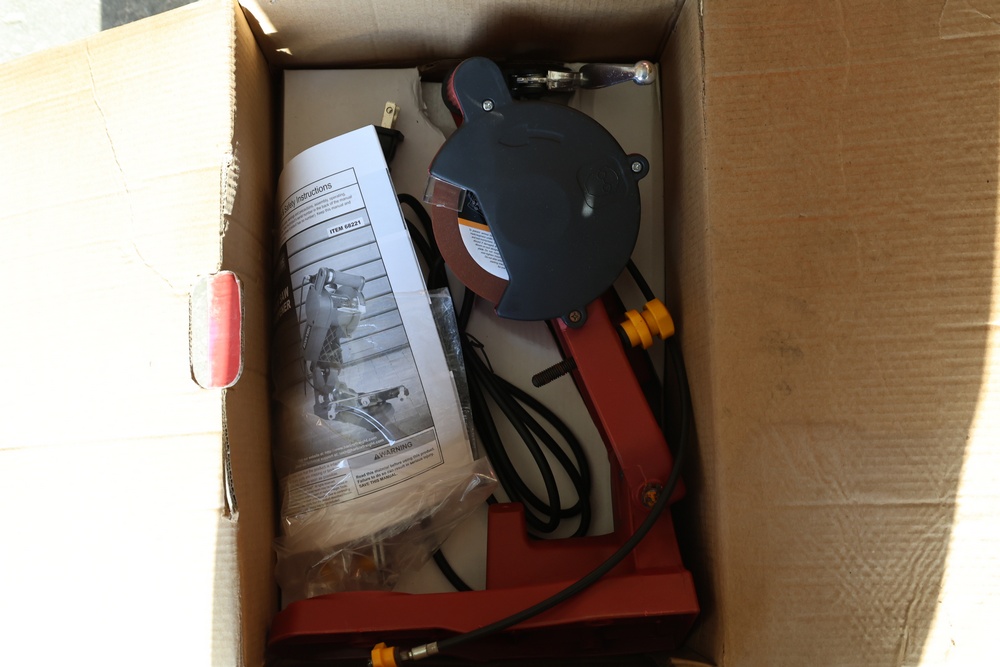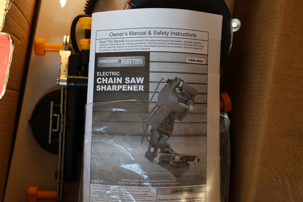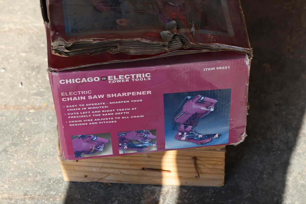 Two Chicago Electric chain saw sharpeners with a Troy-Bilt Tuffy TB20CS gas powered weed whacker and a Craftsman gas powered 28cc blower/vac.
