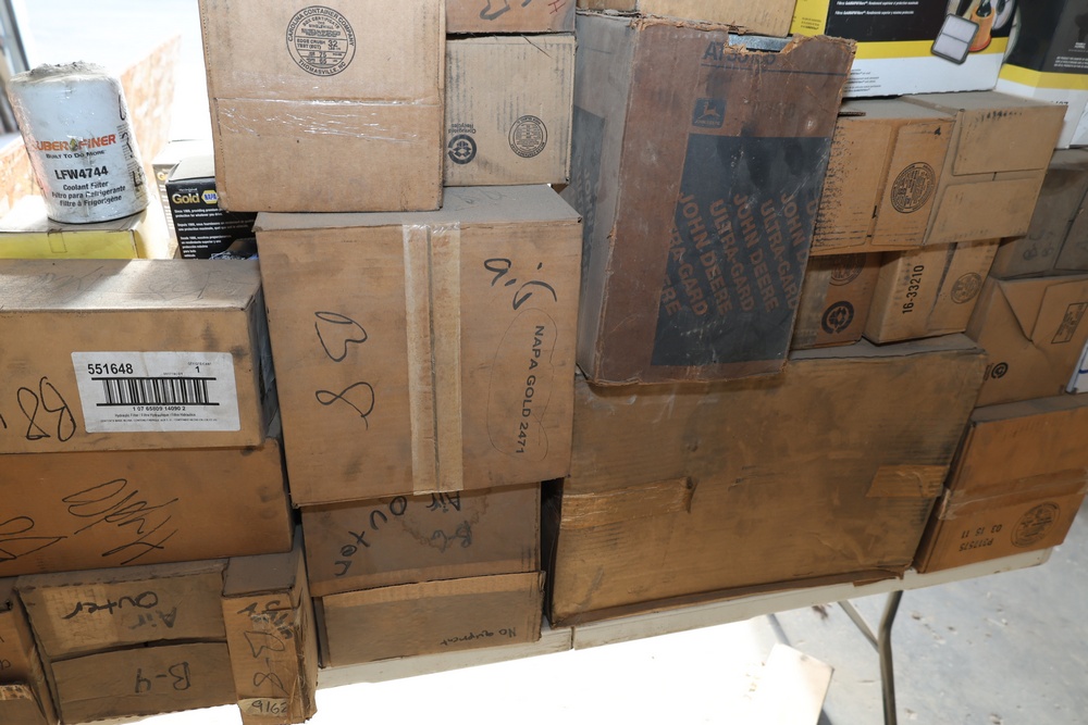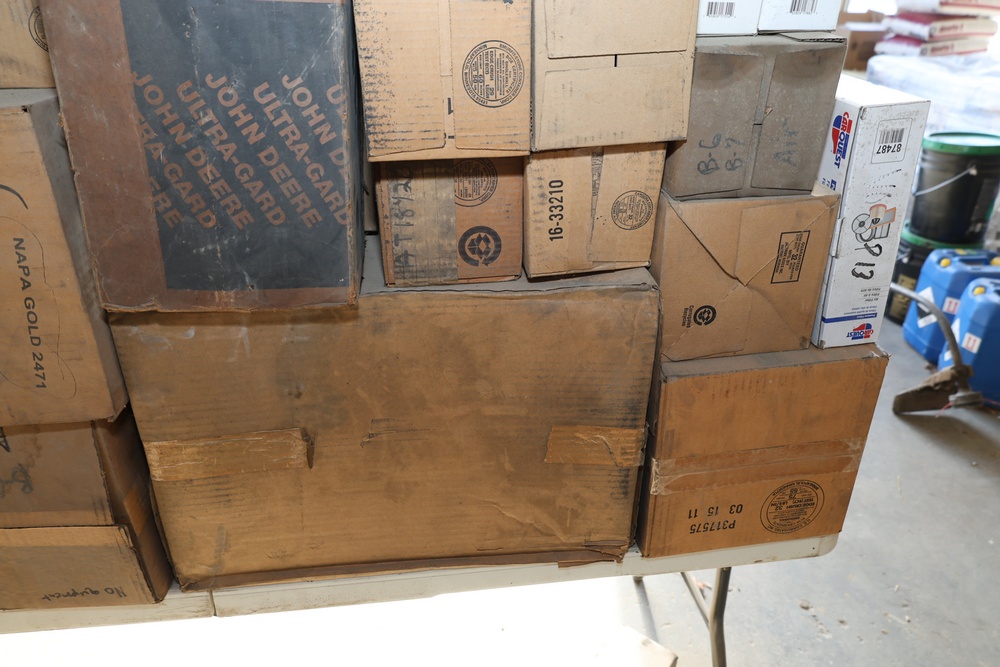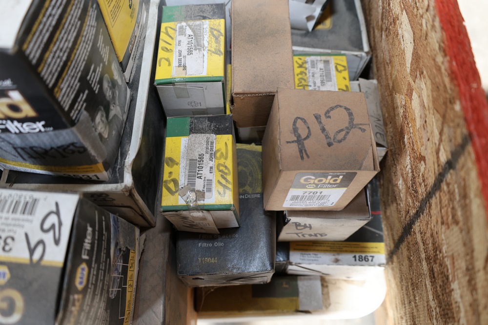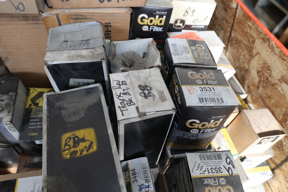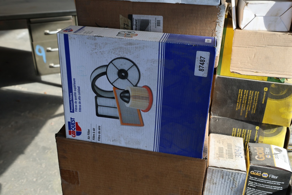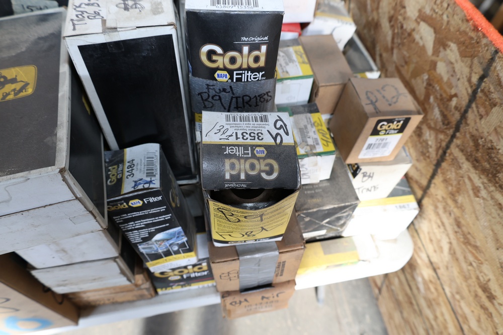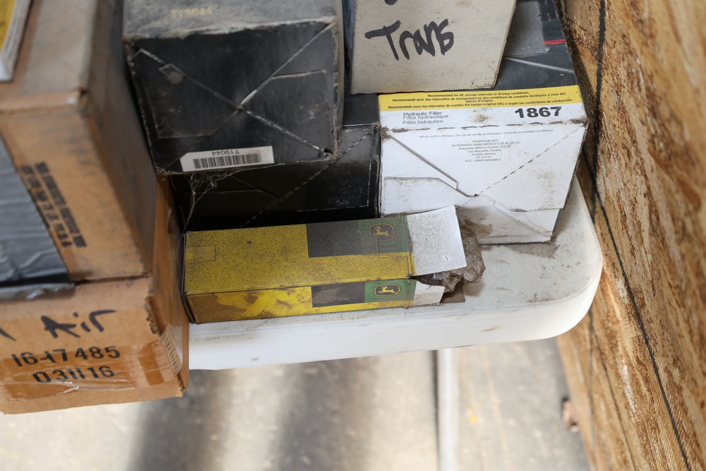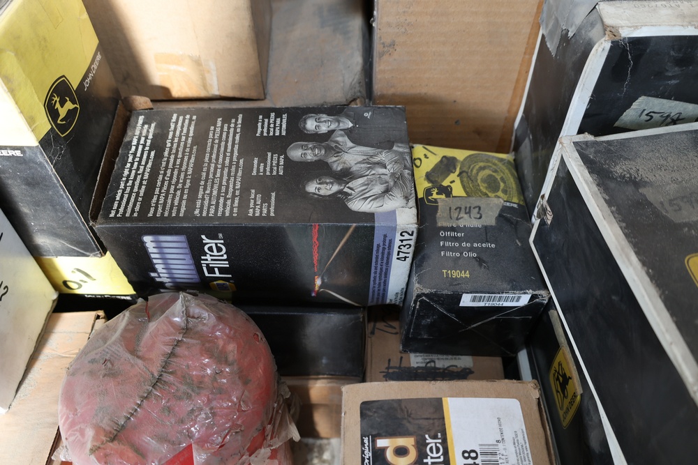This lot includes a large assortment of new and unused filters and related components for heavy equipment and vehicles. The collection contains multiple brands and types, including NAPA Gold Filters, Carquest filters, ProSelect commercial filters, and John Deere filters. The boxes appear to include a range of air, fuel, hydraulic, and oil filters, with several part numbers visible such as NAPA 1748, 3531, and 9184, as well as John Deere references like AT139680 and T19044. The filters are organized in labeled boxes and appear to cover a variety of applications suitable for maintenance and servicing of construction or agricultural machinery.