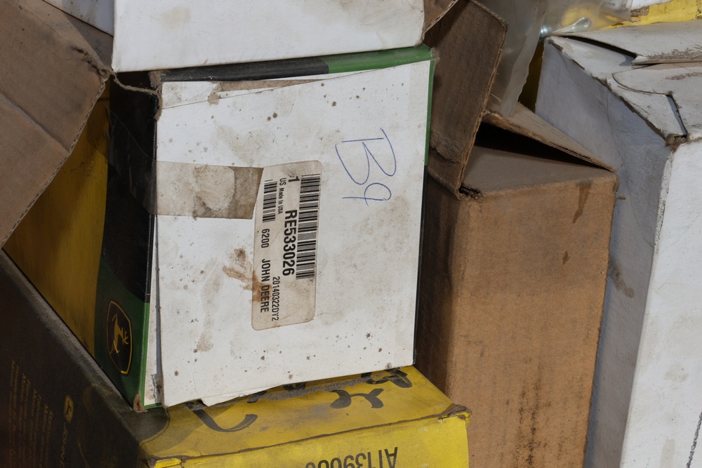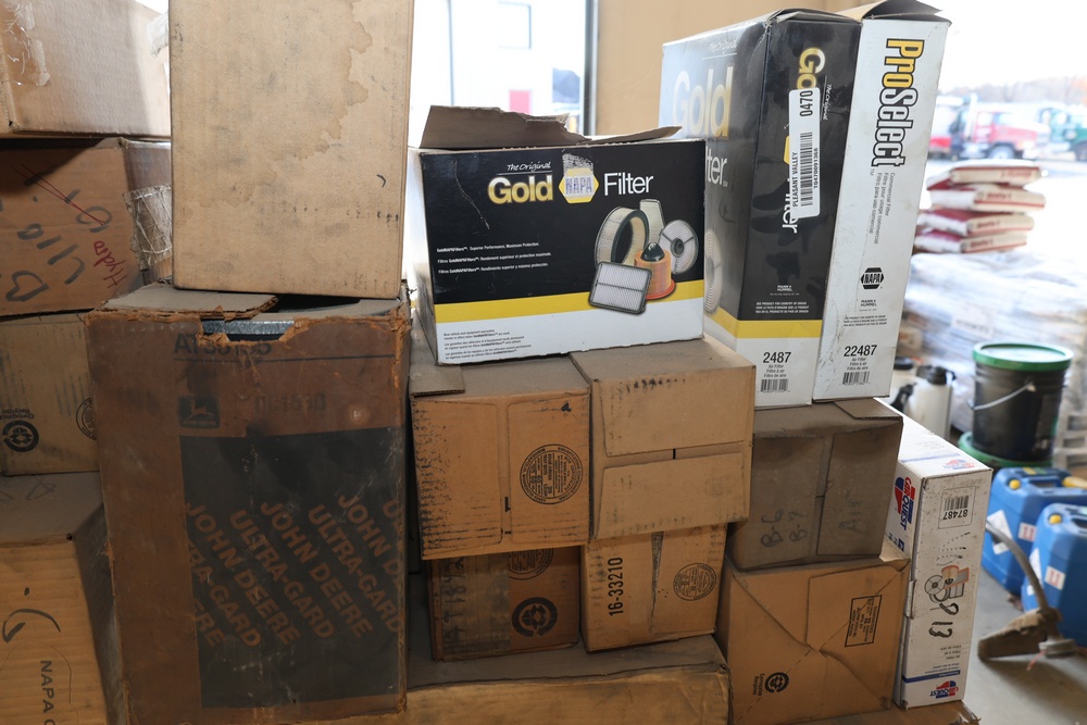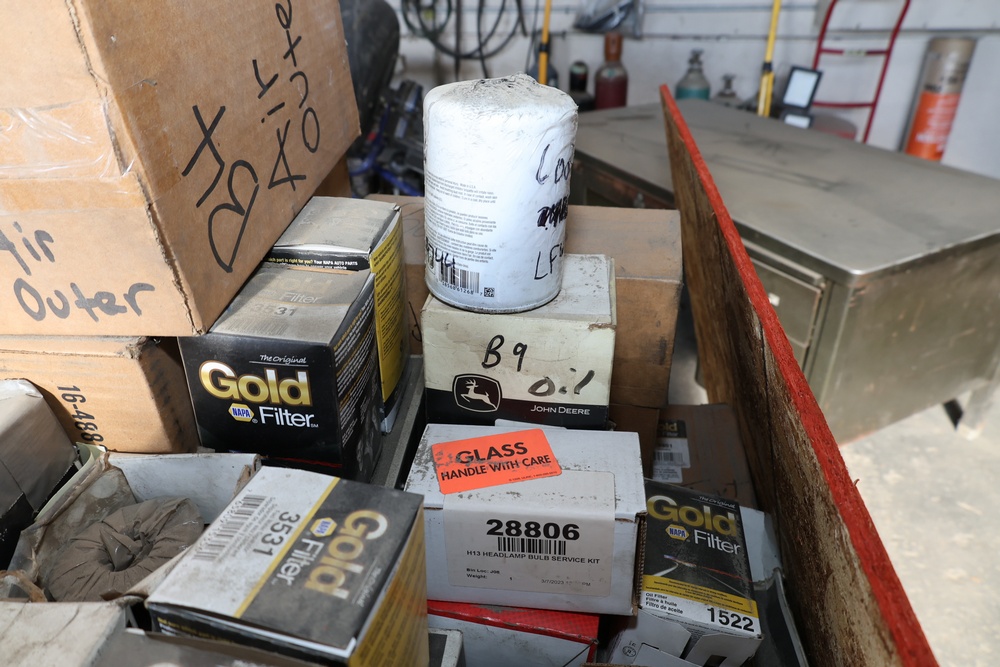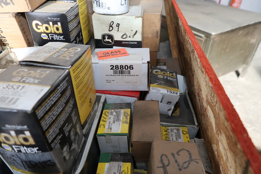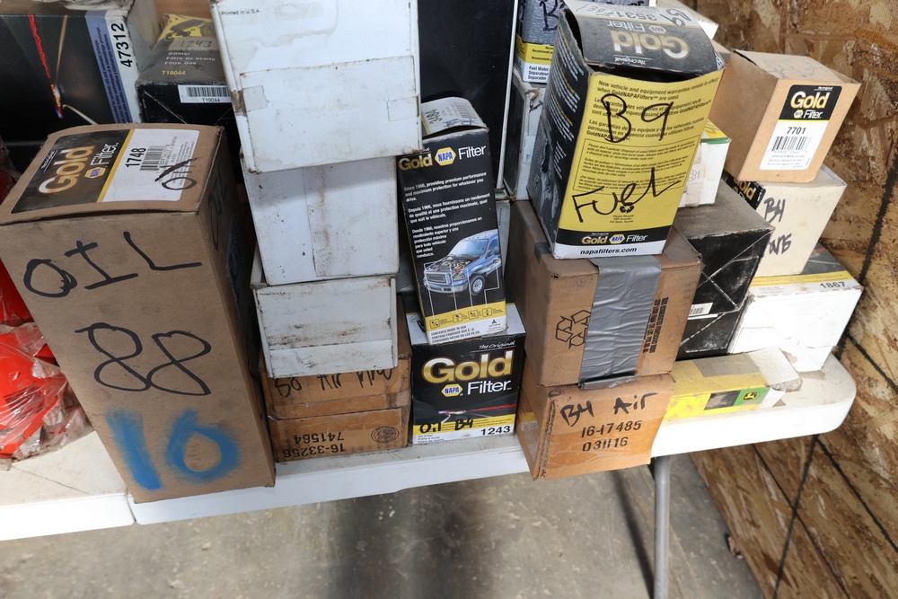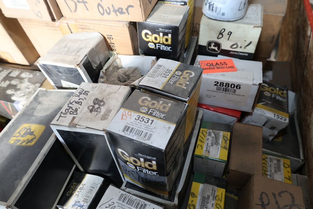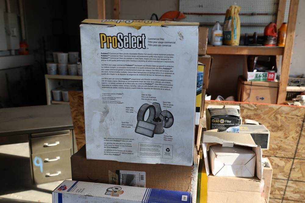 This lot includes a large assortment of new and unused filters and related components for heavy equipment and vehicles. The collection contains multiple brands and types, including NAPA Gold Filters, Carquest filters, ProSelect commercial filters, and John Deere filters. The boxes appear to include a range of air, fuel, hydraulic, and oil filters, with several part numbers visible such as NAPA 1748, 3531, and 9184, as well as John Deere references like AT139680 and T19044. The filters are organized in labeled boxes and appear to cover a variety of applications suitable for maintenance and servicing of construction or agricultural machinery.
