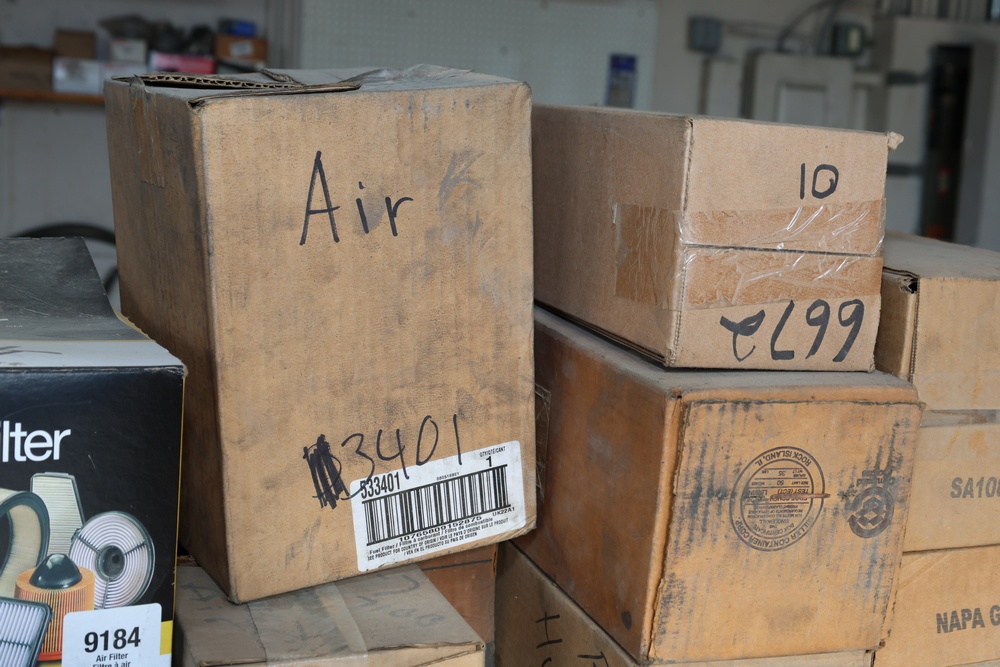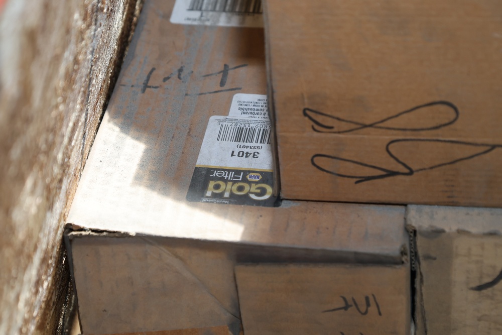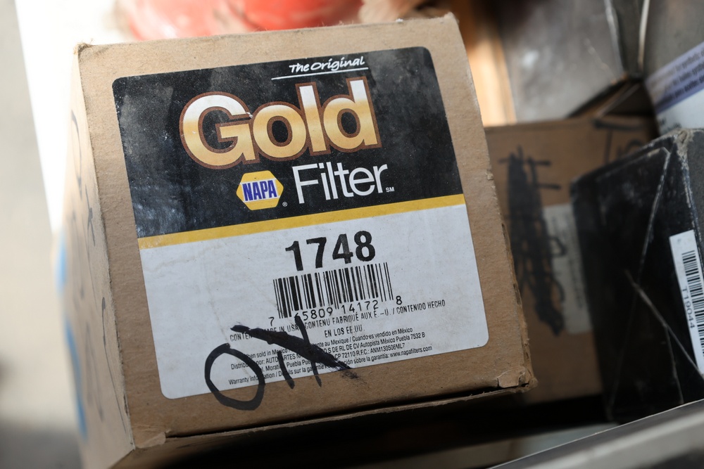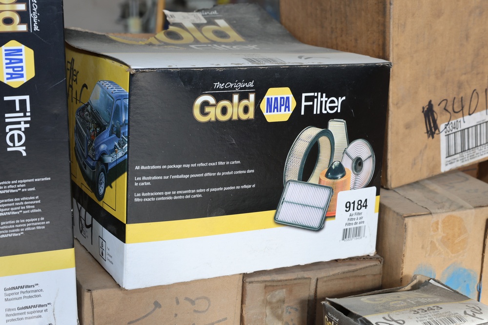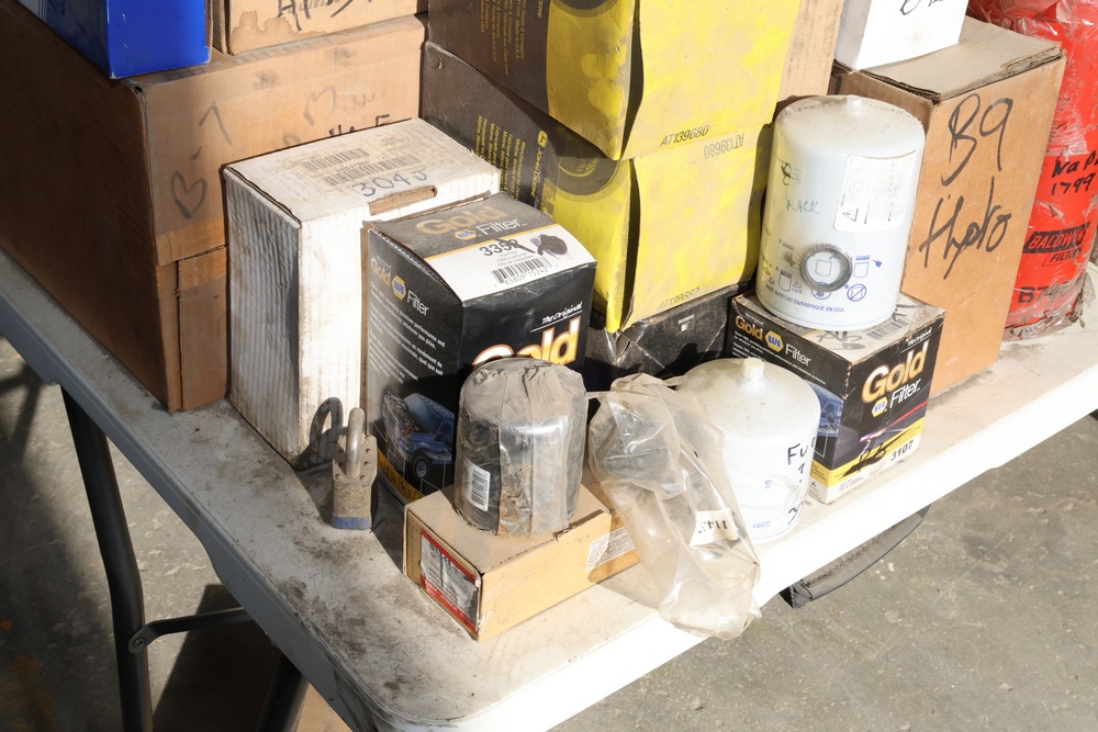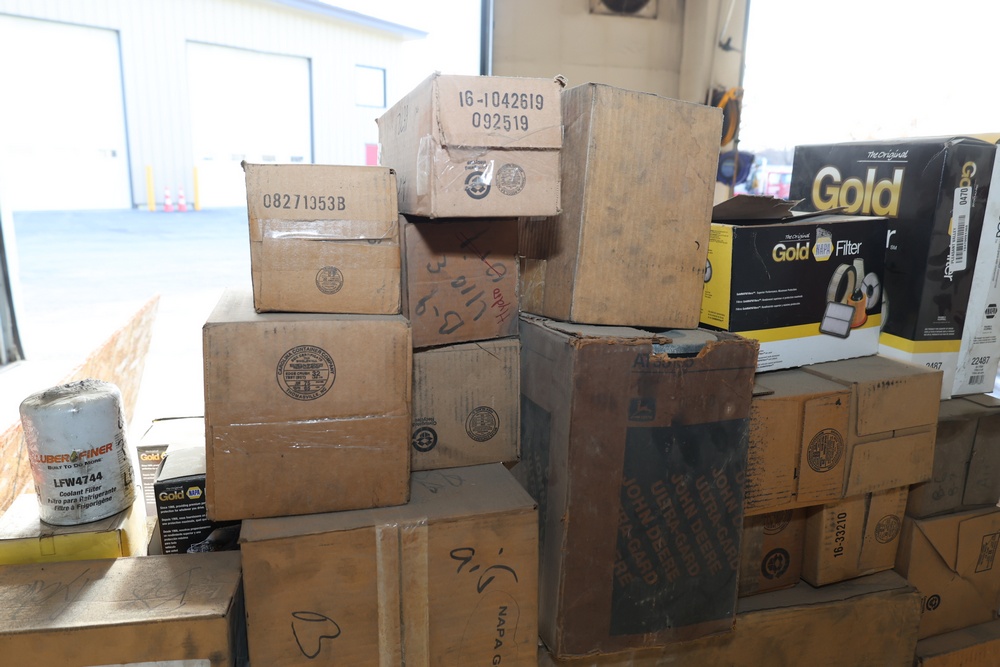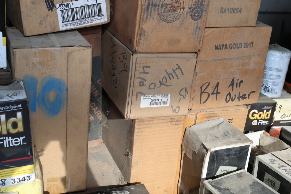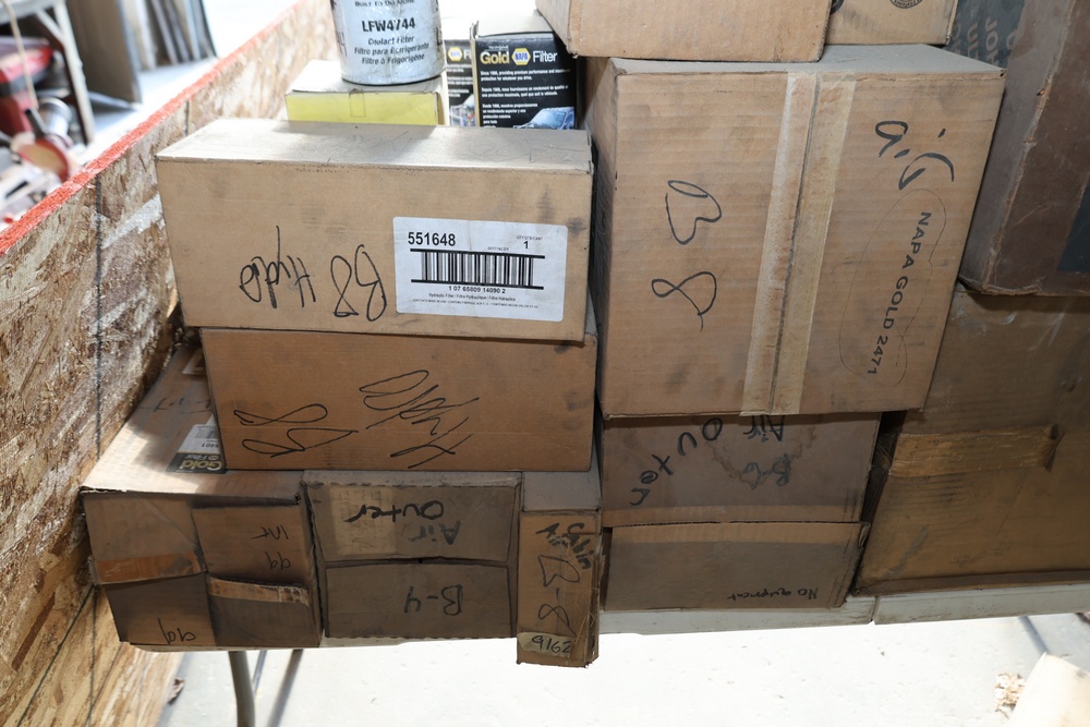 This lot includes a large assortment of new and unused filters and related components for heavy equipment and vehicles. The collection contains multiple brands and types, including NAPA Gold Filters, Carquest filters, ProSelect commercial filters, and John Deere filters. The boxes appear to include a range of air, fuel, hydraulic, and oil filters, with several part numbers visible such as NAPA 1748, 3531, and 9184, as well as John Deere references like AT139680 and T19044. The filters are organized in labeled boxes and appear to cover a variety of applications suitable for maintenance and servicing of construction or agricultural machinery.