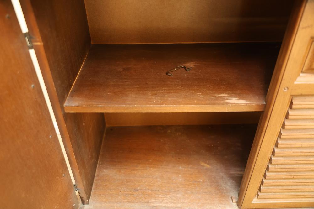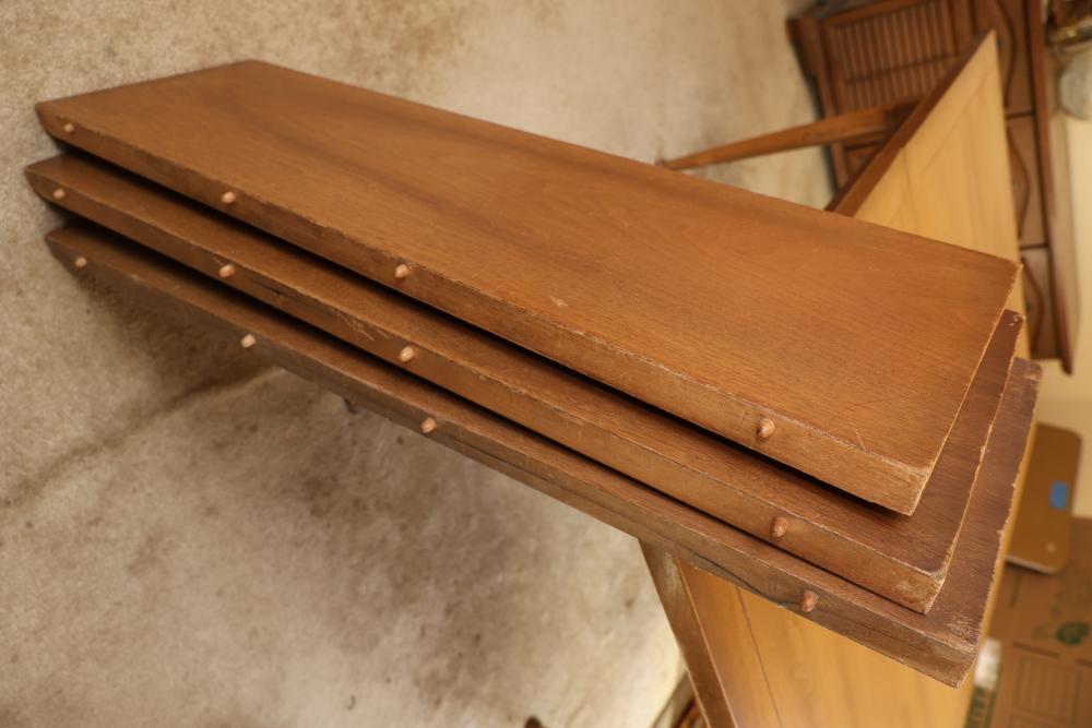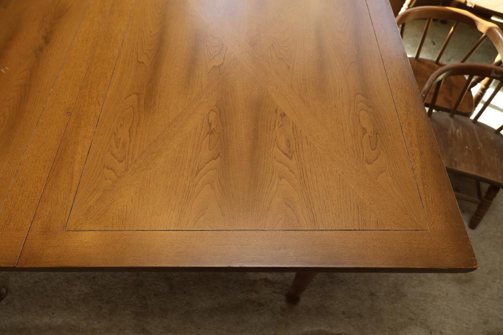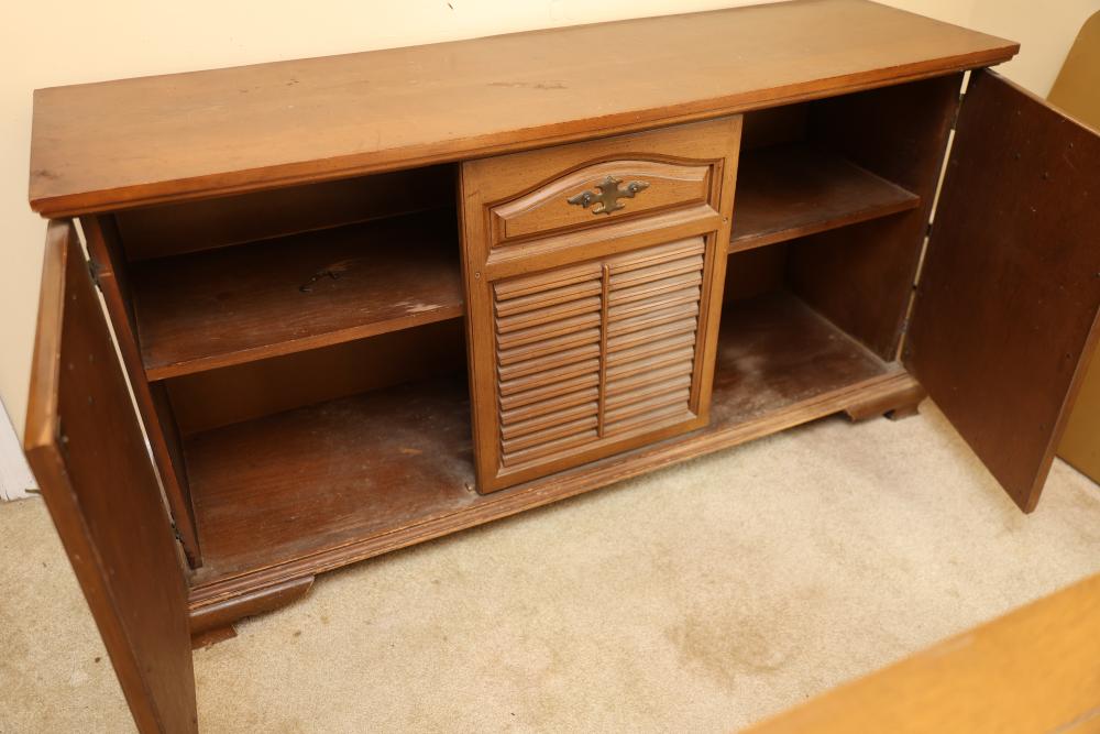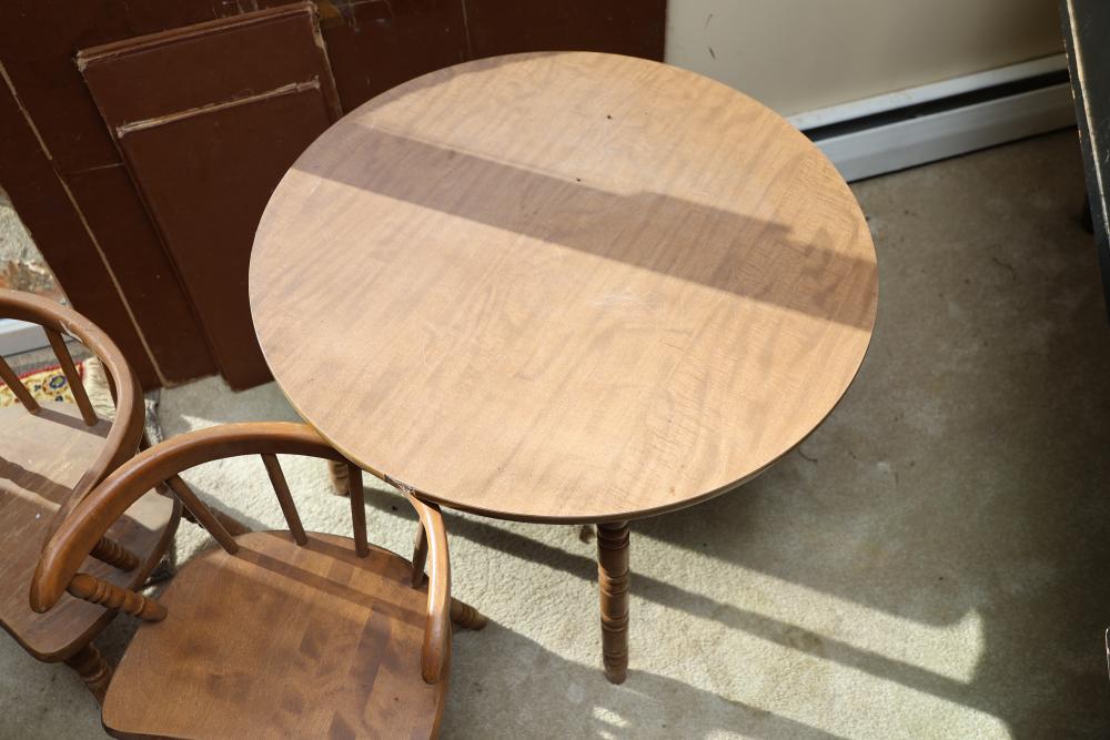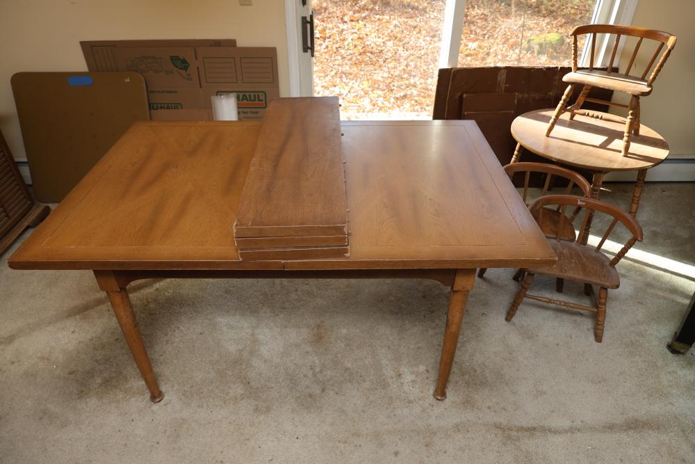 Dining Table with Insert Leaves, Round Table, Spindle-Back Chairs, and Three-Door Buffet Table. Includes an expandable rectangular dining table with three insert leaves 60in 40in x 30in, a round wooden table with spindle legs 30in x 23in, three spindle-back wooden chairs, a three-drawer wooden utility cabinet with hinged doors, and a three-door wooden buffet table with slatted front doors and interior shelving 50in x 17in x 30in. Buyer is responsible for all help and materials necessary for safe and proper removal. Buyer must take all. Pickup only.