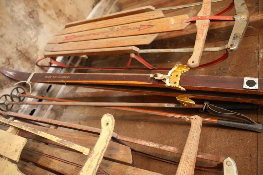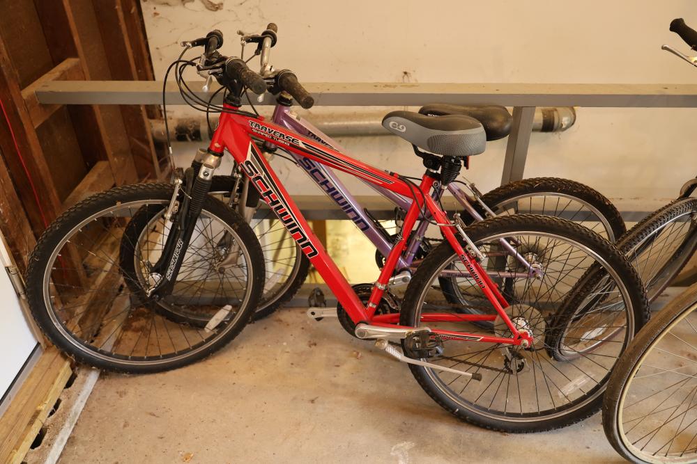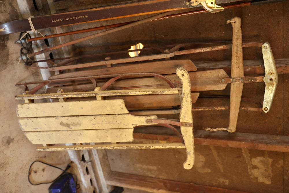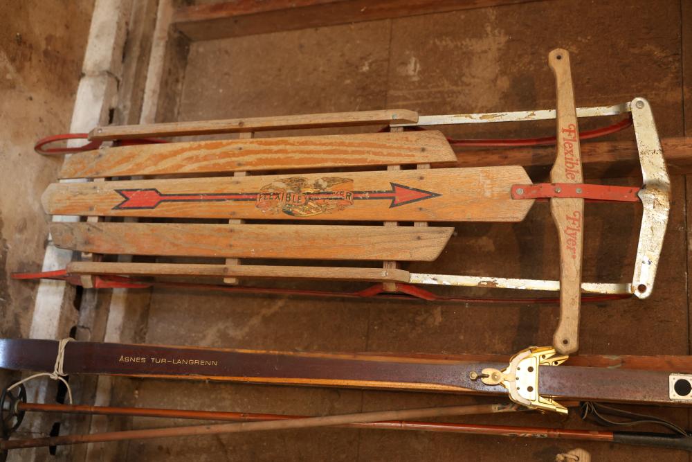 Bicycles, sleds, and Nordic skis. Includes multiple bicycles featuring Schwinn, Huffy, and additional brands, ranging from adult to child sizes with varied frames and handlebars. Includes Flexible Flyer and other vintage-style sleds in wooden designs and complementing Nordic skis marked Åsnes Tur-Langrenn with attached poles. Buyer is responsible for all help and materials necessary for removal. Buyer must take all. Pickup only.
