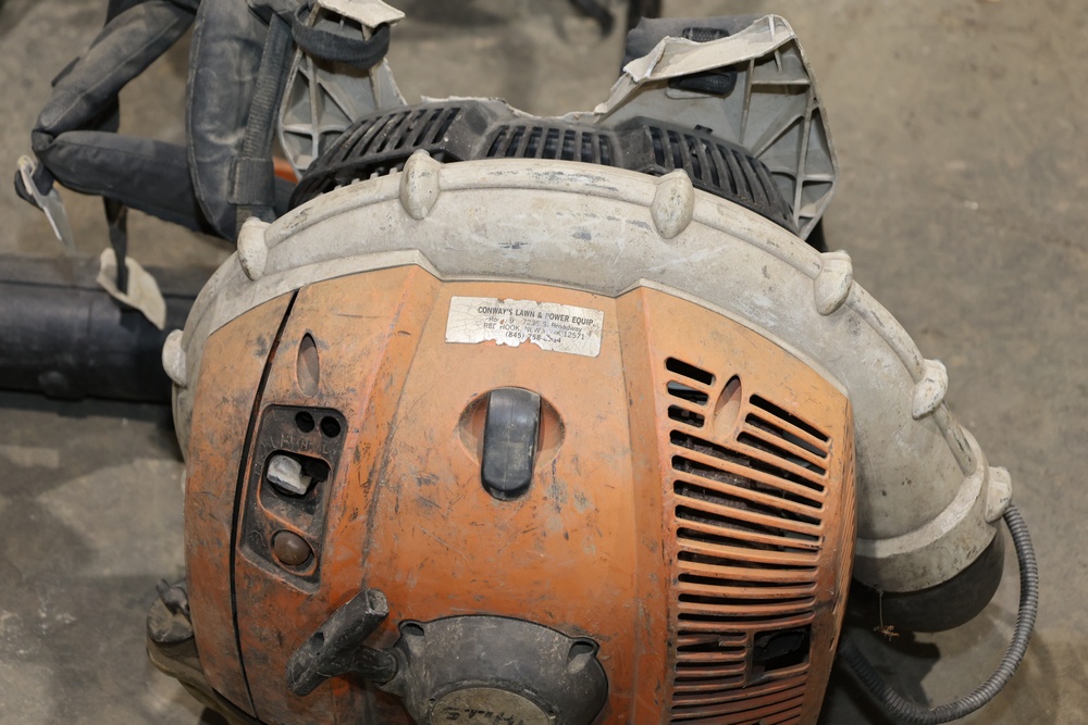Items include 2017 Polaris Ranger XP 1000 EPS with a dump bed; Riverside pump 328GPM 3" trash pump; Honda WT30X trash pump; Stihl 65CC backpack blowers; Stihl handheld leaf blower & Napa Industrial air compressor with pump. Items are located in Rhinebeck, NY.