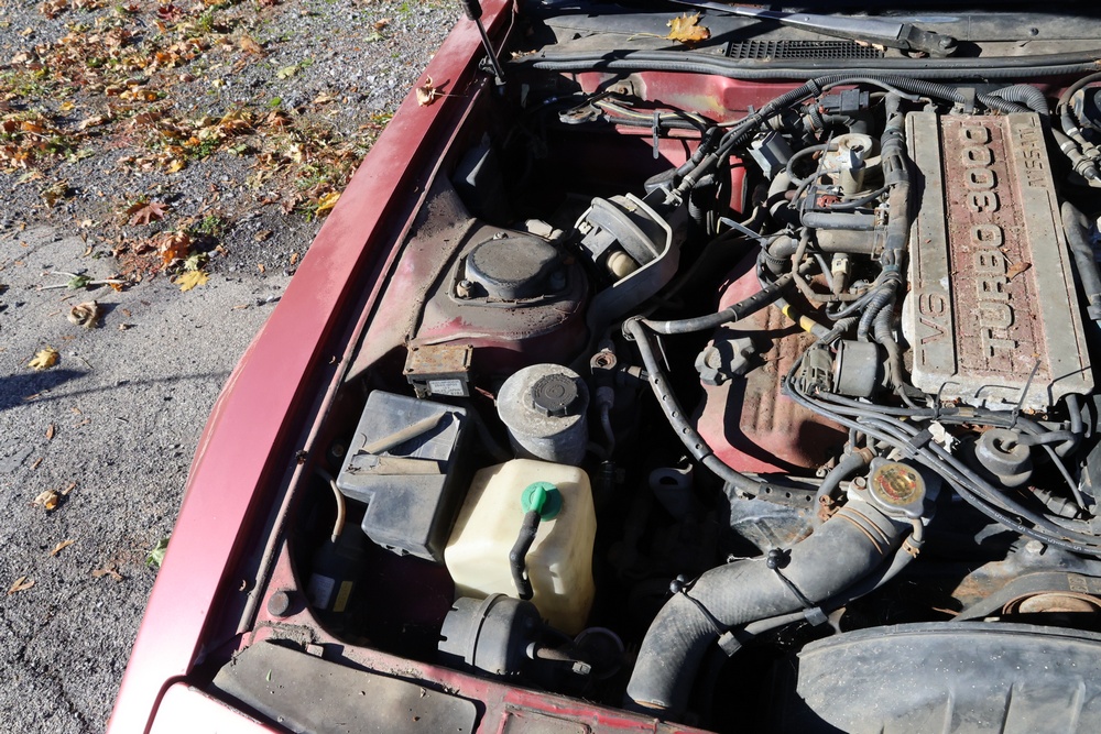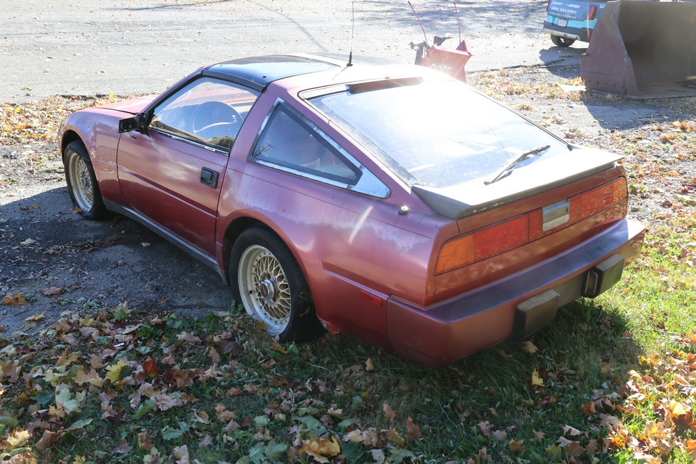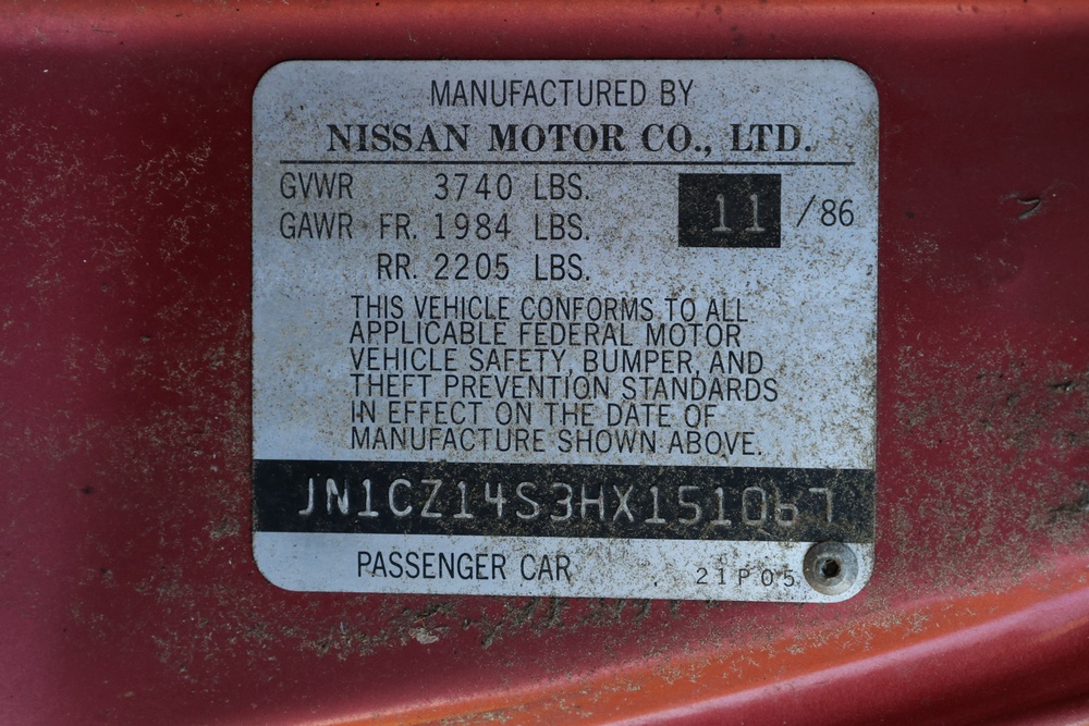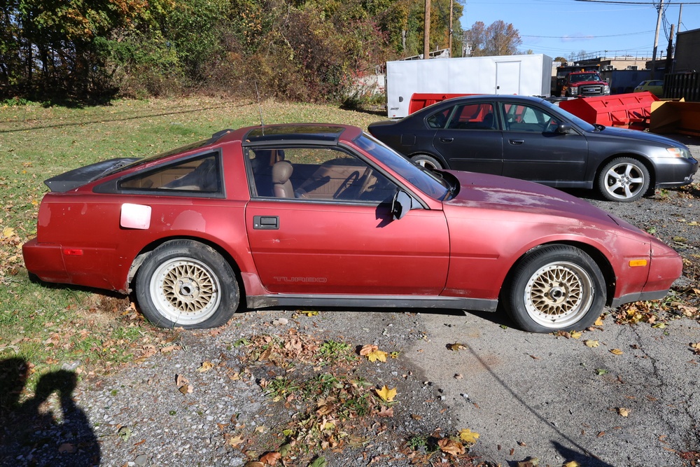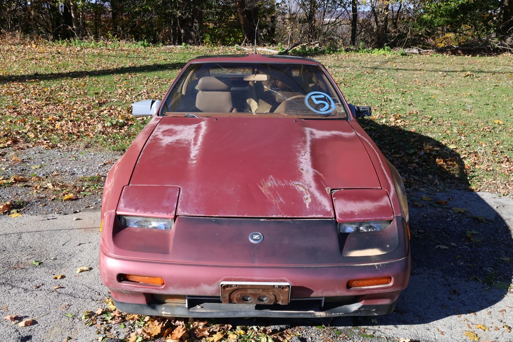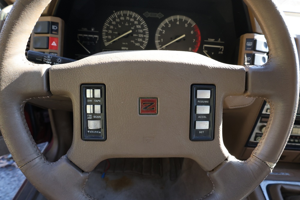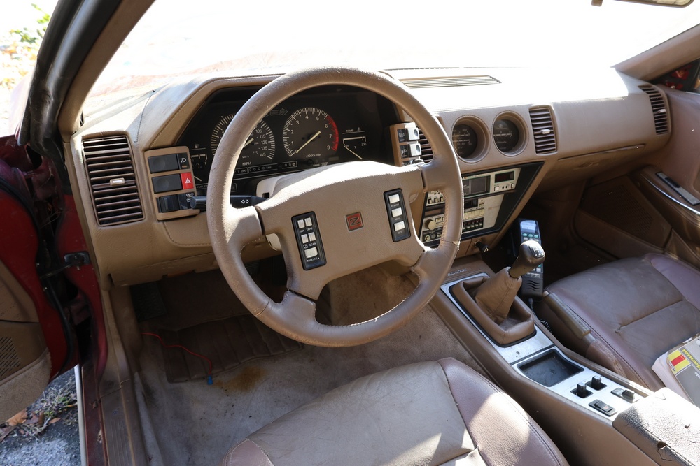1986 Nissan 300ZX 2-door coupe with 5-speed manual transmission. VIN: JN1CZ14S3HX151067. Odometer reading: 69,521 miles. Exterior: Burgundy paint with pop-up headlights, alloy wheels, side mirrors, and Z emblem on the hood. Interior: Brown leather seats, digital climate control, factory AM/FM cassette stereo with equalizer, mobile phone, and 5-speed floor shifter. Tire configuration: Standard coupe with alloy wheels. Additional equipment includes T-top roof, power accessories, and analog instrument cluster. Title and key available. Seller reports: Ran, drove, and dealer maintained when last used in the early 2000s.