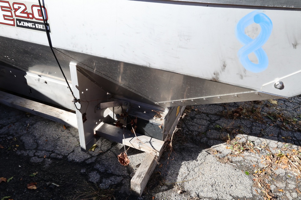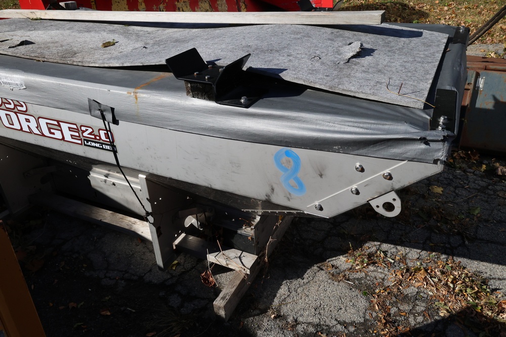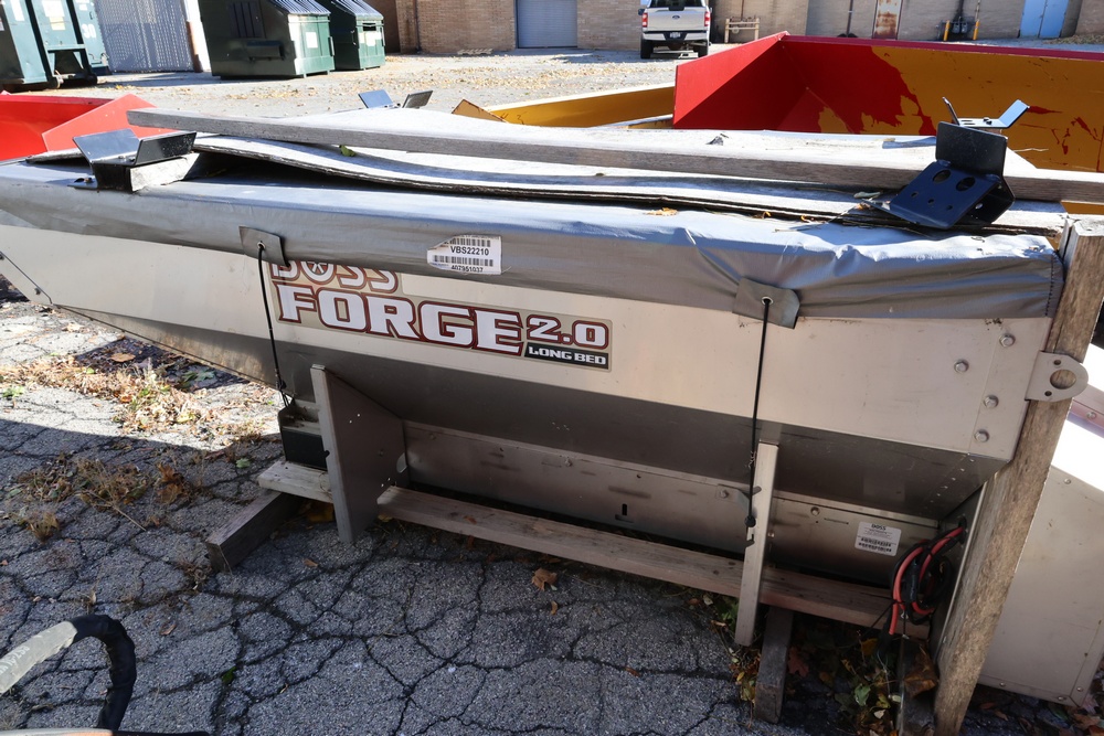 Boss Forge 2.0 Long Bed V-Box Spreader manufactured by Boss Products in Iron Mountain, Michigan, USA. The part number is VBS22210 and the serial number is 407951037. The spreader was manufactured in 2020 and is configured with a pintle chain feed system. Seller reports: Brand new, never opened.