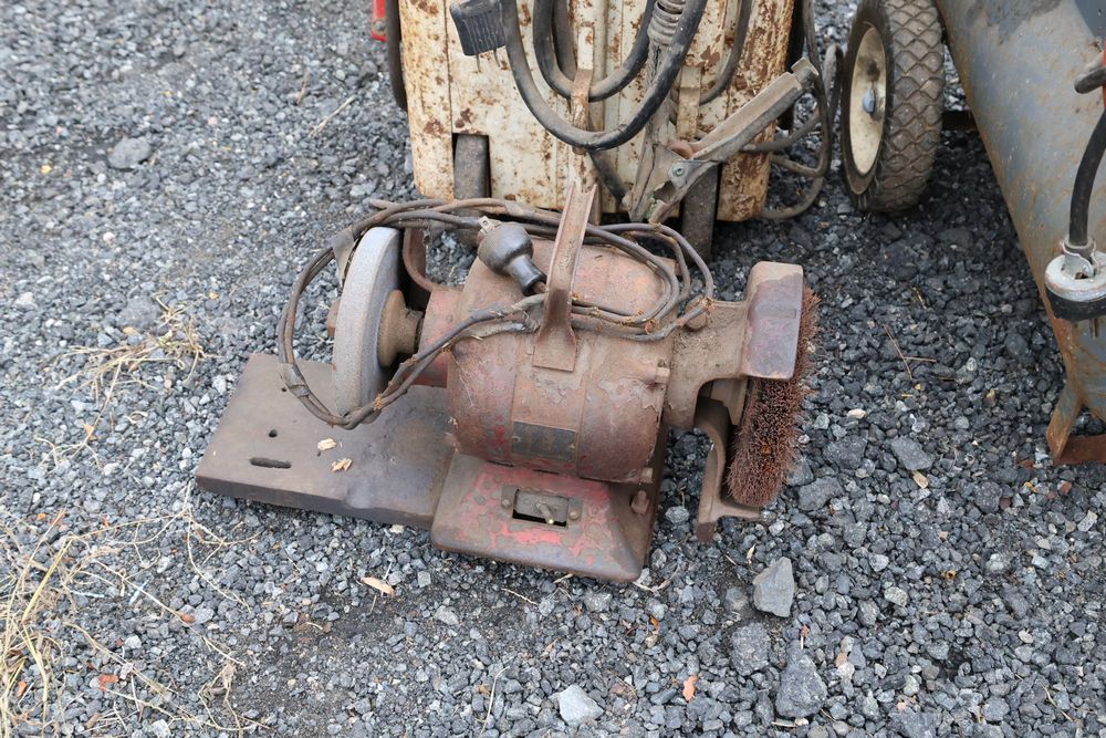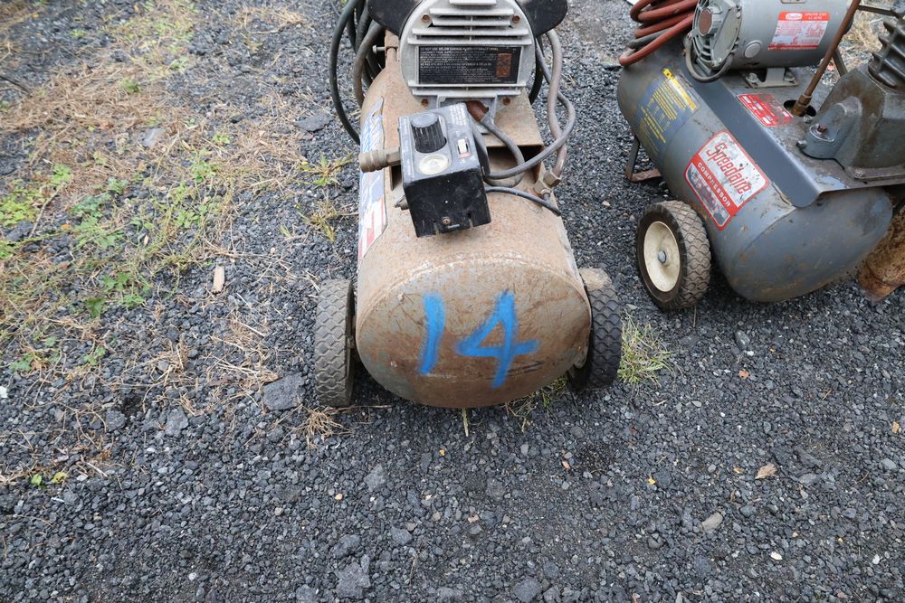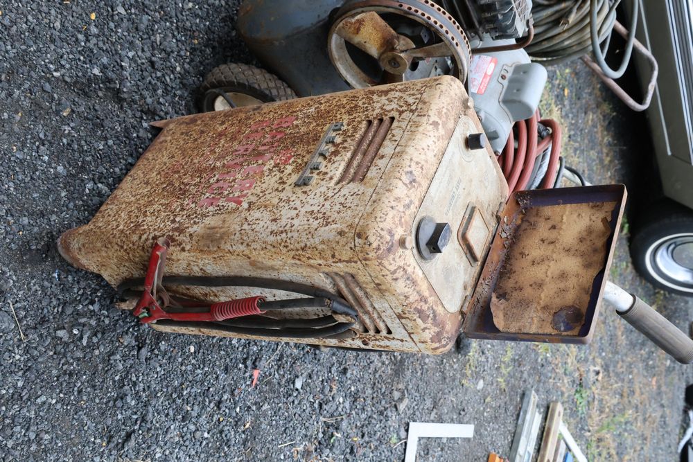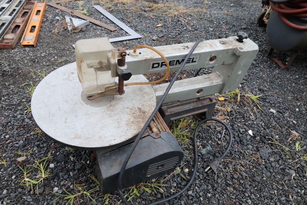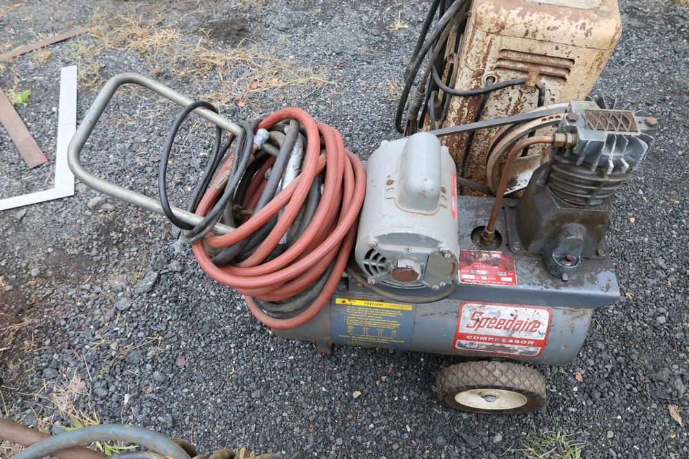 Tools including Campbell Hausfeld air compressor, Speedaire air compressor, Dremel saw, portable battery charger, and grinder. Seller reports: worked when last used, not recently tested.