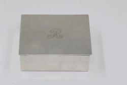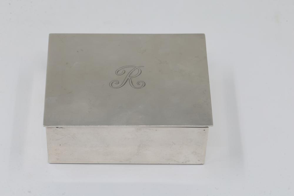 Tiffany & Co. Sterling Silver Box with Inscription and Monogrammed Lid. The box features a hinged lid with an engraved 'R' and an interior dated inscription reading 'September 25, 1952.' The exterior is stamped with 'Tiffany & Co. Makers Sterling Silver 23325 M'. Total weight being 314 grams.