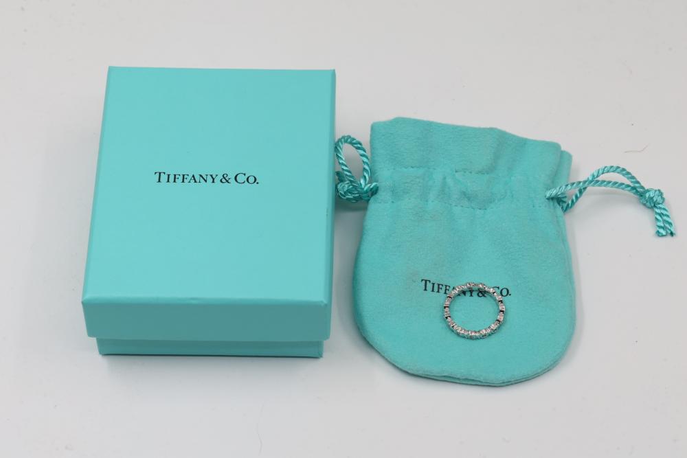 New Tiffany & Co. 18K White Gold Full Circle Metro Diamond Wedding Band Ring in Original Box. Features an 18K band adorned with diamonds, inscribed with hallmarks. Includes the original Tiffany & Co. blue box with the interior black velvet insert. Size 4.5. Total weight being 2.6 grams. Retail value of $4,000.