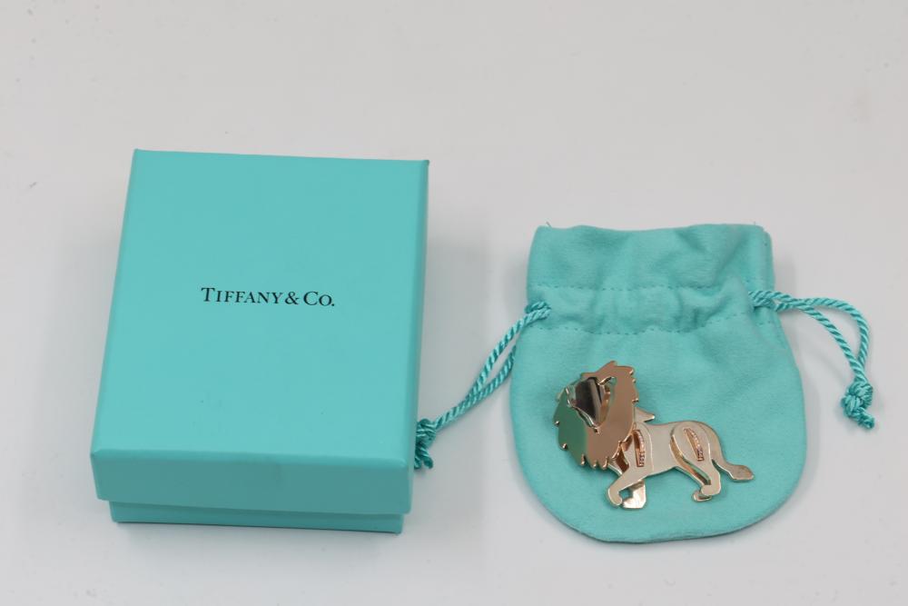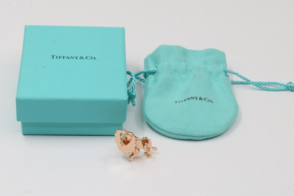 New Tiffany & Co. Rose Gold Save The Wild Lion Pin with Diamond Accents. Crafted from 18k gold, this lion-shaped pin features diamond accents adorning the legs, adding a touch of brilliance. Includes its signature Tiffany & Co. pouch. Total weight being 12.7 grams. Retail value of $3,500.