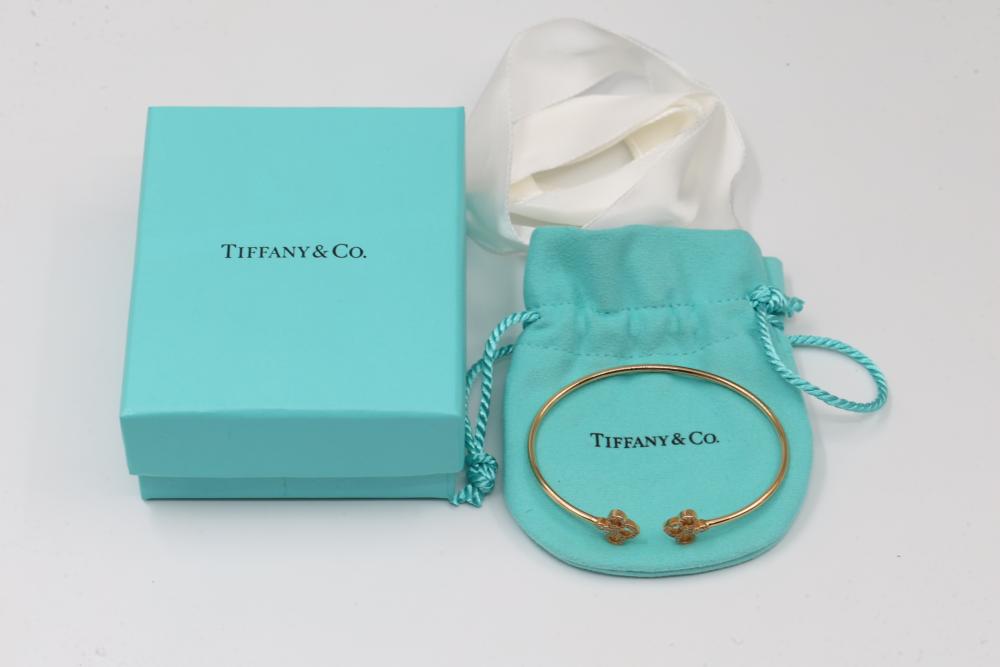 New Tiffany & Co. "Fleur de Lis" 750 Rose Gold wire cuff Bangle With Decorative Ends. This piece is marked 750, indicating 18-karat gold composition. It features a sleek design with intricate decorative ends and includes the signature Tiffany & Co. blue pouch. Total weight being 5.8 grams. Retail value of $4,500.