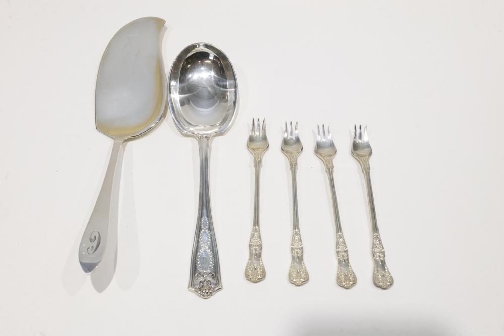 Sterling Silver Serving Pieces and Dessert Forks by Tiffany & Co. includes a sterling silver pie server, large serving spoon with engraved floral details, and four smaller dessert forks featuring ornate patterns. Each piece is marked 'Tiffany & Co. Sterling.' Total weight being 389 grams.