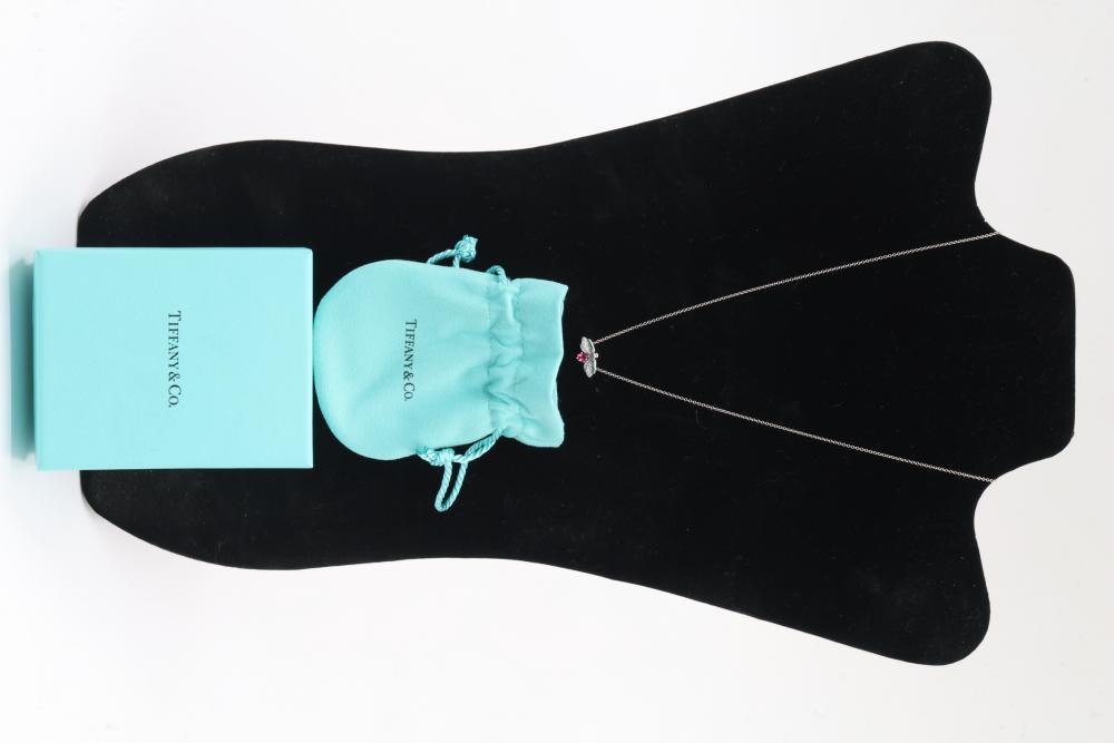 New Tiffany & Co. Platinum Necklace with Rubellite Diamond Paper Flowers Firefly Pendant Necklace. Crafted in platinum, this necklace features a firefly-shaped pendant adorned with sparkling diamonds and a pink gemstone as the body. Includes the original Tiffany & Co. pouch. In excellent condition. Total weight being 3 grams. Retail value of $3,000.