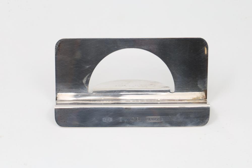 Tiffany & Co. Sterling Silver 925 Letter Holder. Crafted from sterling silver with visible hallmarks including "T&CO 1837" and "925." Stamped with "1999 Tiffany & Co." Polished metal surface and functional letter-slot design. Total weight being 43.