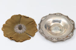 Tiffany & Co. Sterling Silver Dish and Pincushion Set. The dish features scalloped edges, marked 'Tiffany & Co. 15411 Makers 7113 Sterling Silver 925-1000,' and includes engraved details. The pincushion consists of fabric with a silver-tone finial marked 'Tiffany & Co. 8240 Makers 220 Silver-Soldered.' Total weight of sterling silver being 100 grams.
