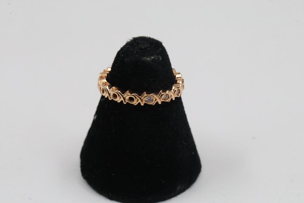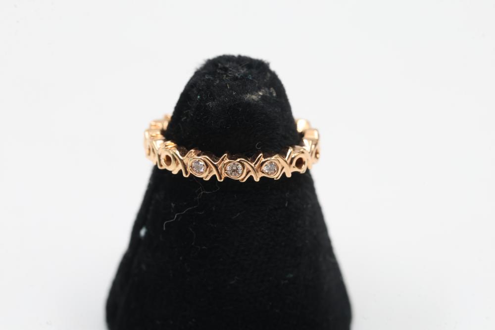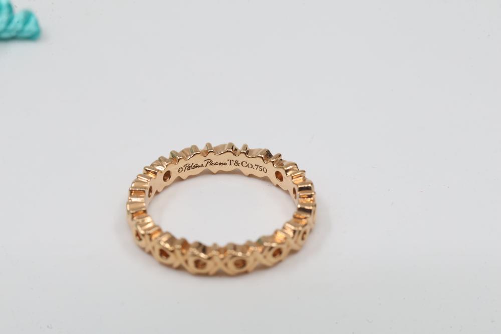 New 18K Rose Gold & Diamonds Tiffany & Co. Paloma Picasso Graffiti Narrow Love Kisses Ring. Designed by Paloma Picasso, this ring features a graffiti-inspired design with "love" and "kisses" motifs. Crafted in 18K rose gold, it is a striking addition to any jewelry collection. Size 5.25. Total weight being 3.5 grams. Retail value of $2,500.