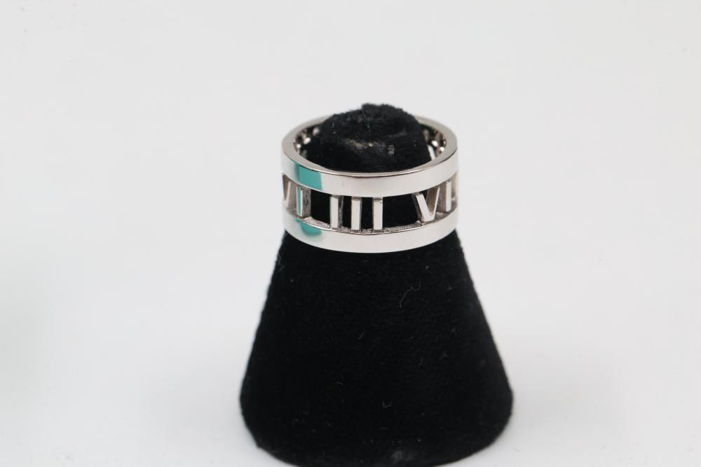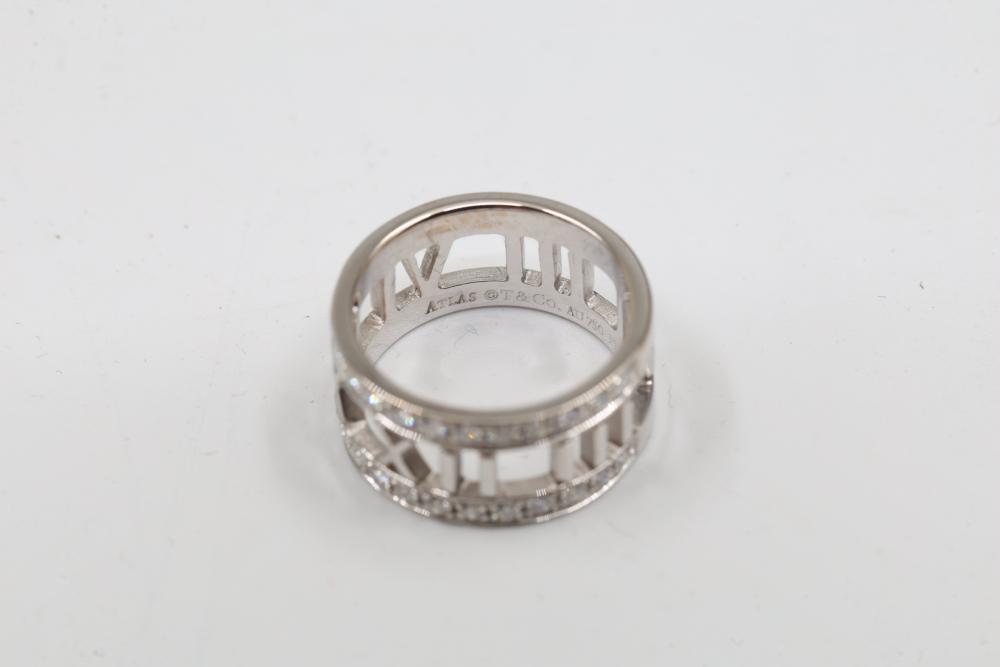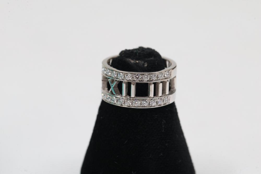 New Tiffany & Co. Atlas Roman Numerals Ring in 18K White Gold with Diamonds. Features an openwork design of Roman numerals highlighted with diamond accents. Hallmarked with the brand name and metal purity. Comes with a Tiffany & Co. turquoise case. Size 5. Total weight being 5.4 grams. Retail value of $5,000.