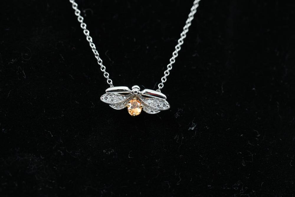 New Tiffany & Co. Platinum Firefly Pendant Necklace with Diamonds and Yellow Spessartine from "Paper Flowers Spessartine Firefly" Collection. Features a platinum chain and bee-shaped pendant adorned with diamonds and a yellow Spessartine centerpiece. Includes the signature Tiffany & Co. pouch. Total weight being 3 grams. Retail value of $3,000.