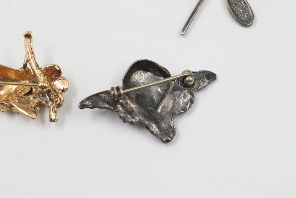 Six Brooches in Sterling and Gold-Tone Designs. Includes intricately detailed owl, angel, greyhound, bee, and two dragonfly designs, as well as various marked 925 sterling silver accents. Fine craftsmanship and unique styling in each piece. Total weight being 42 grams.