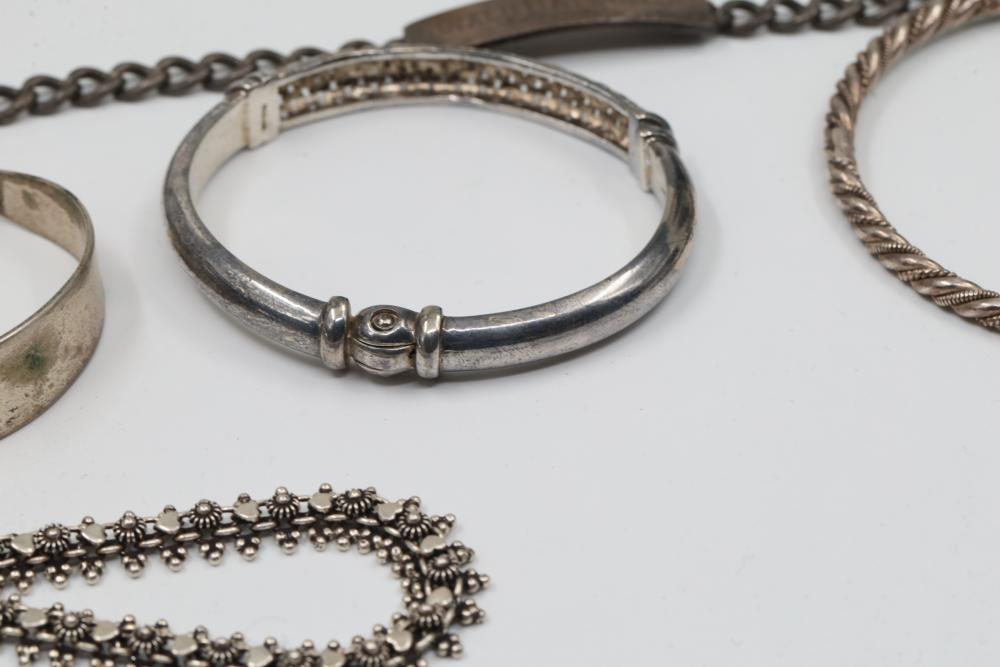 Sterling Silver and Mixed Metal Bracelets and Bangles. Includes various designs and styles with some featuring hallmarks and stamps such as 925 Sterling, 18K accents, and decorative motifs. Total weight of 224 grams.