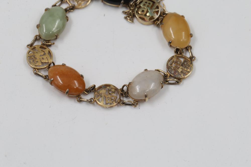 Silver Bracelet With Multicolored Jade and Symbolic Accents. Features alternating oval Jade in green, black, yellow, orange, and white hues. Accented with gold-tone symbols linked on a delicate chain. Marked 'Silver' on the clasp. Total weight being 12 grams.