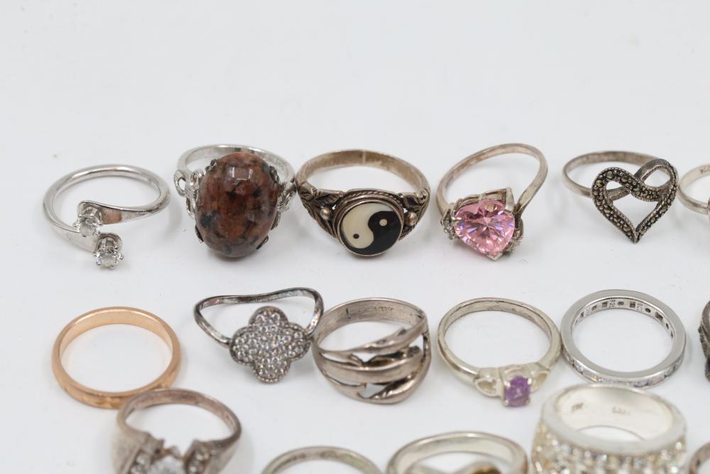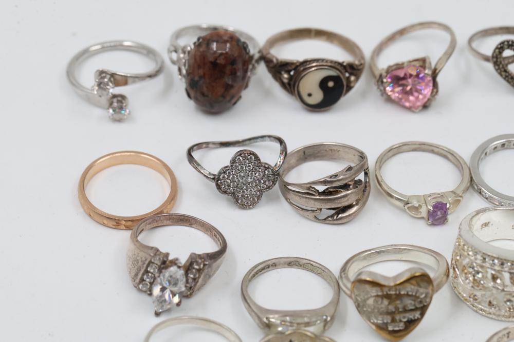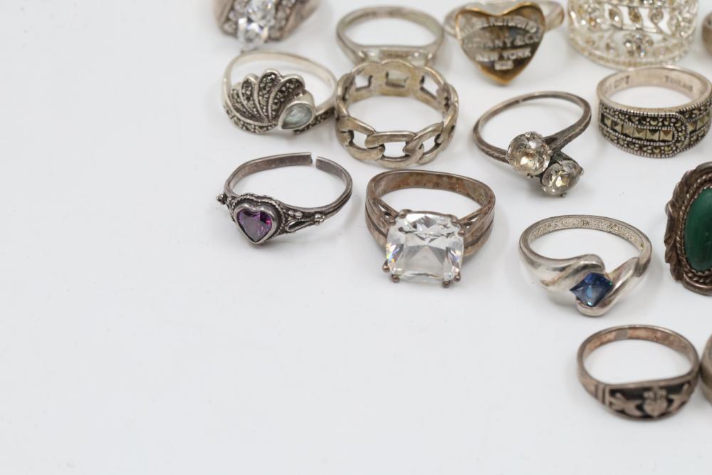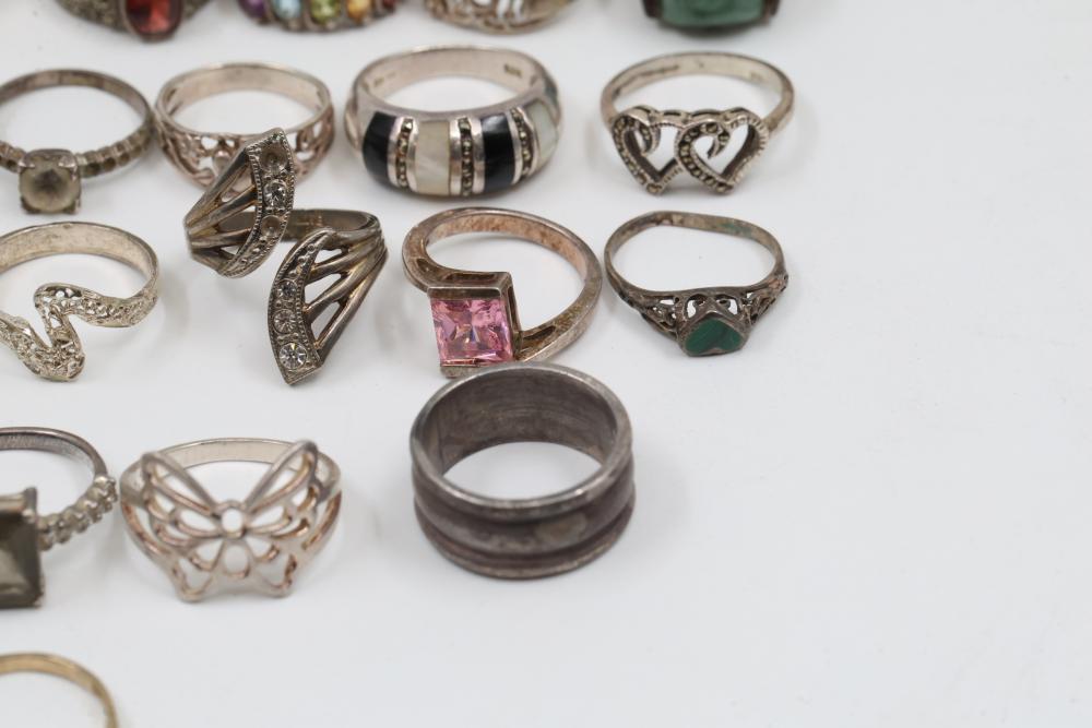 Rings with Gemstone and Metal Designs. Includes a variety of designs ranging from filigree settings, colored stones, and intricate metalwork. Notable features include heart motifs, bow shapes, inset gemstones, and textured bands. Mixed materials may be present, including metal and imitation or natural stones. Sterling weight being 39 grams. Total weight being 213 grams.