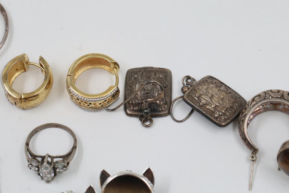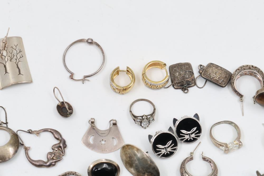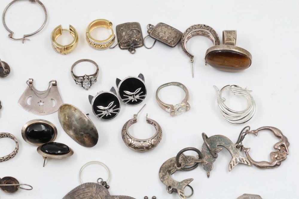 Silver and costume jewelry, featuring rings, earrings, pendants, and pins. Includes pieces with various designs, stones, and engraved elements. Sterling weight being 146 grams. Total weight being 239 grams.