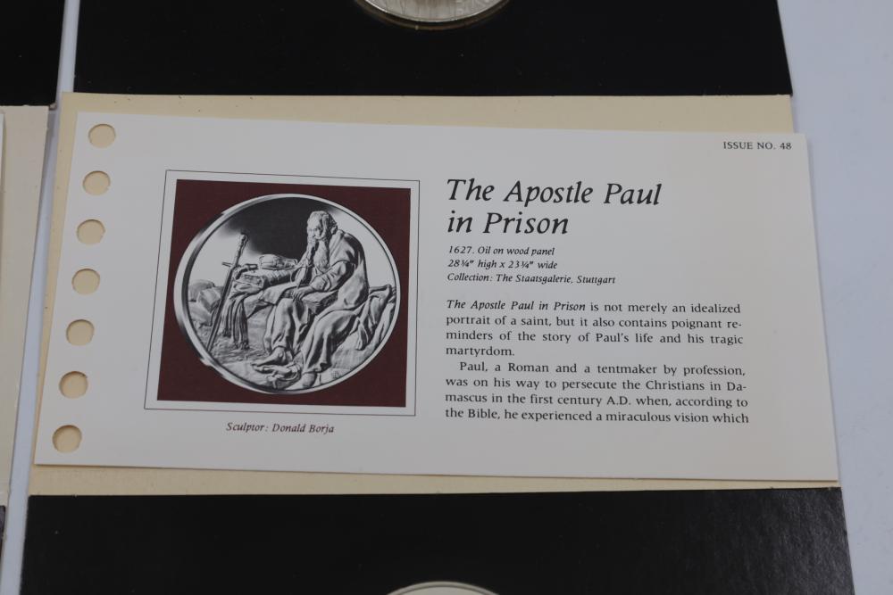 (4) Franklin Mint sterling silver medallions depicting works inspired by Rembrandt, including "Portrait of Nicolaas van Bambeeck", "Portrait of Agatha Bas" and "The Apostle Paul in Prison". Each medallion features etched details with inscriptions on the reverse, presented alongside descriptive inserts. Total weight being 264 grams.