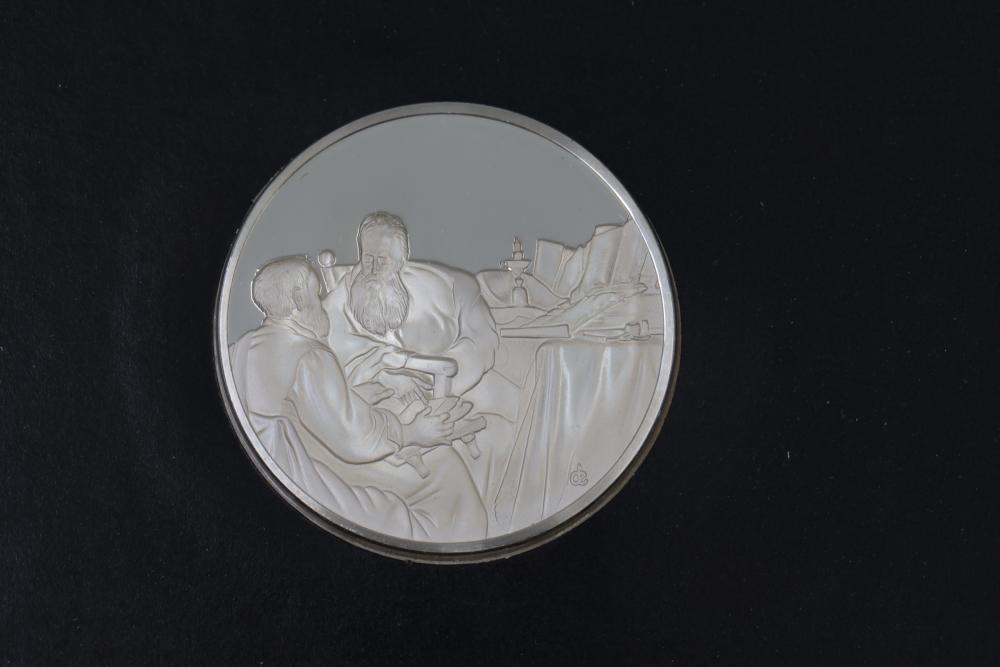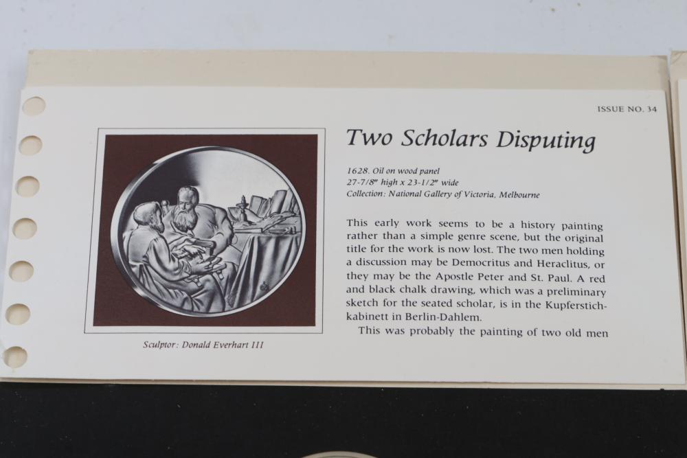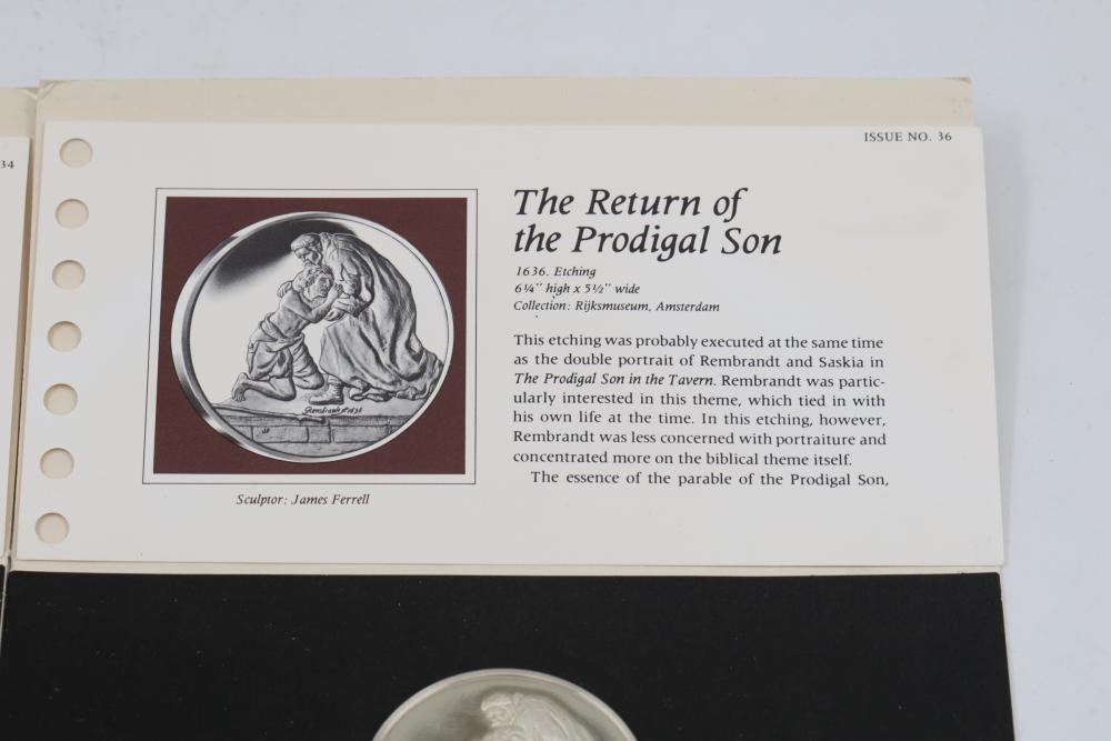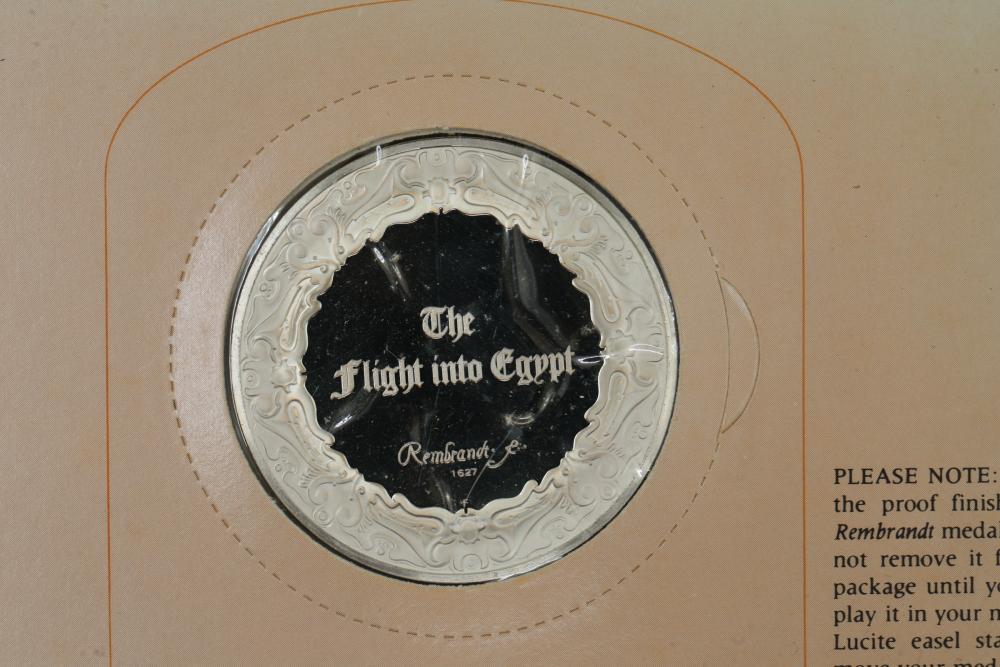(4) Franklin Mint sterling silver-toned medals inspired by works of Rembrandt, including "Two Scholars Disputing", "The Flight into Egypt", "Self-Portrait" and "The Return of the Prodigal Son". Each medal features a sculpted design on the obverse and descriptive text on the reverse. Includes corresponding booklet pages with image details and background information. Total weight being 264 grams.