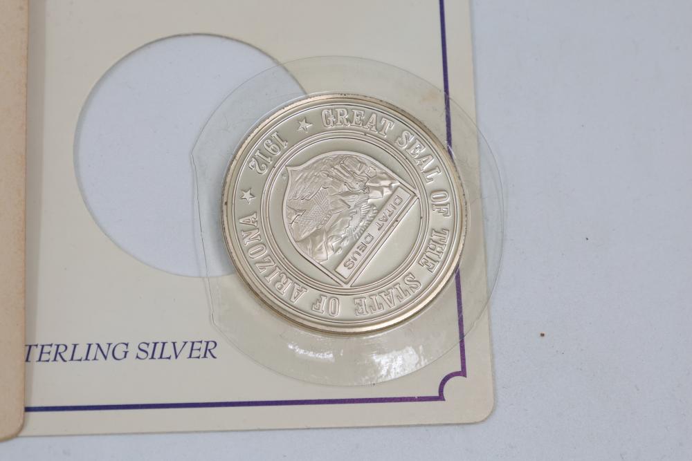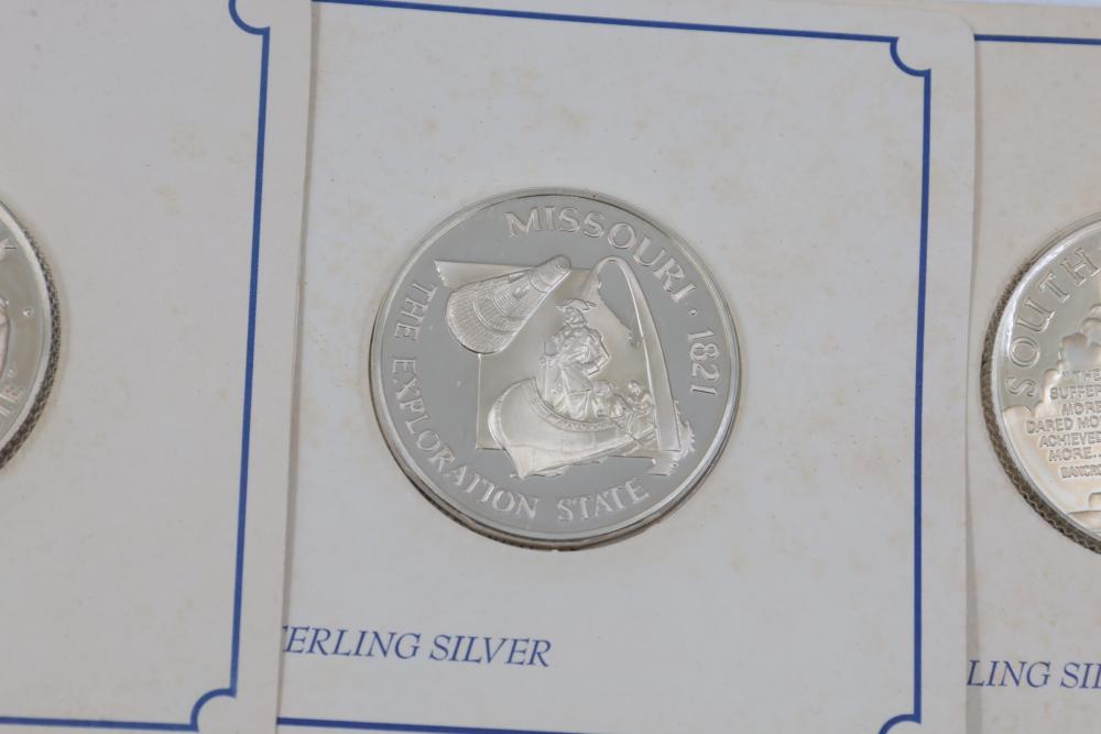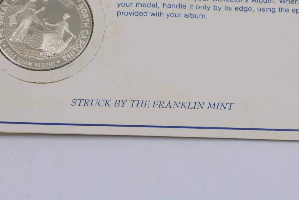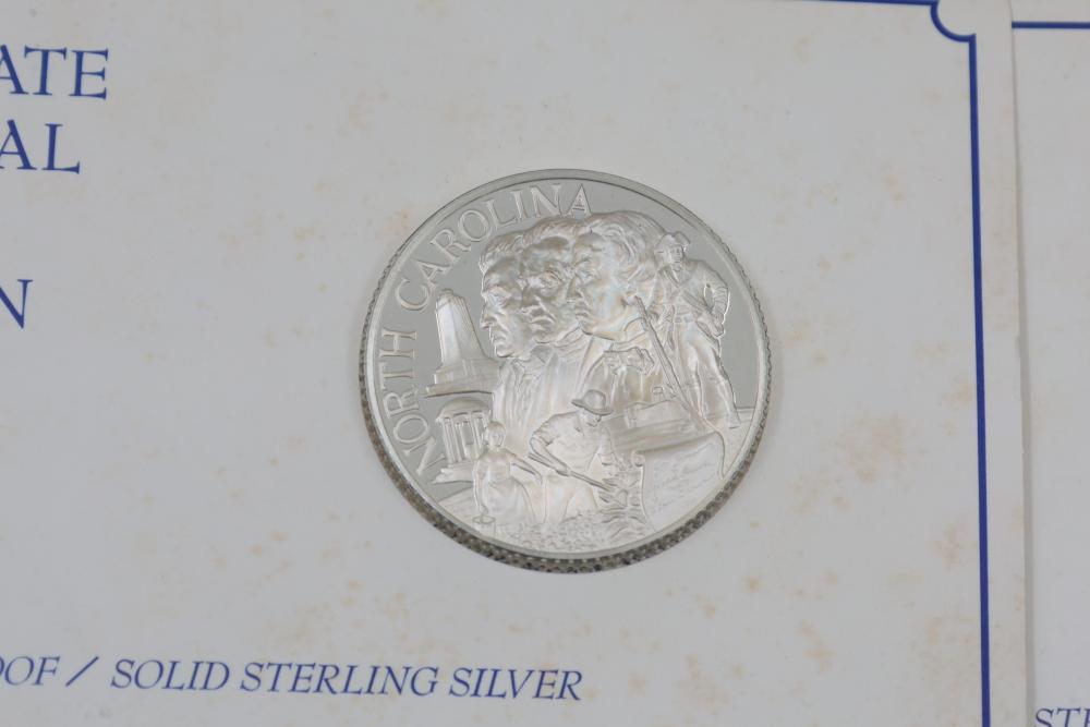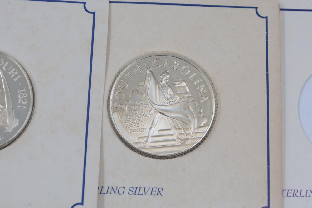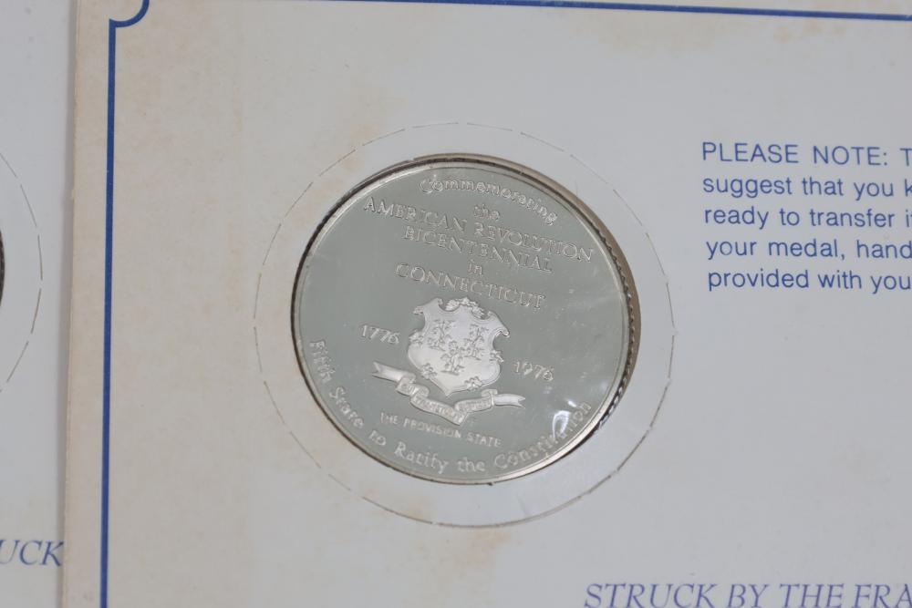 (7) Fifty-State Bicentennial Solid Sterling Silver Medals by Franklin Mint. A collection of solid sterling silver medals, each representing a U.S. state with historical and state-themed designs. Each medal is marked as proof and housed in original packaging provided by Franklin Mint. 10 coins total. Total weight being 224 grams. Each coins weighs approximately 32 grams.