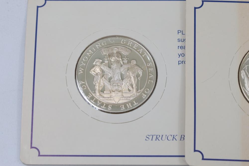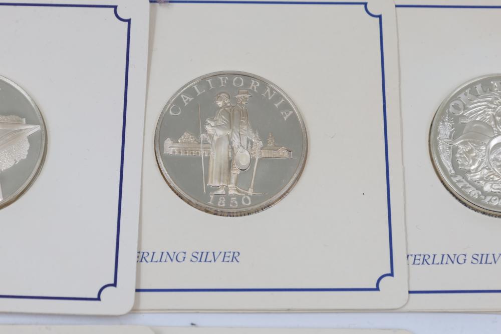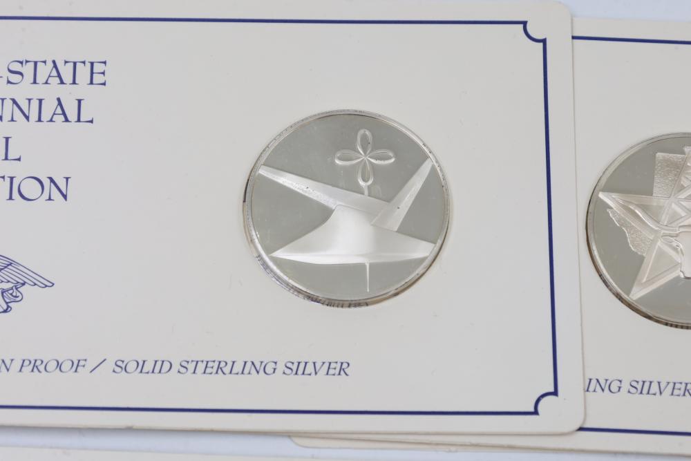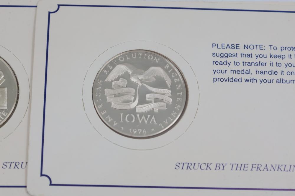 (10) Fifty-State Bicentennial Sterling Silver Proof Medals. Includes first-edition proof medals crafted from solid sterling silver, each representing a U.S. state. Medals are mounted on presentation cards with detailed inscriptions. 10 coins total. Total weight being 320 grams. Each coin weighs approximately 32 grams.