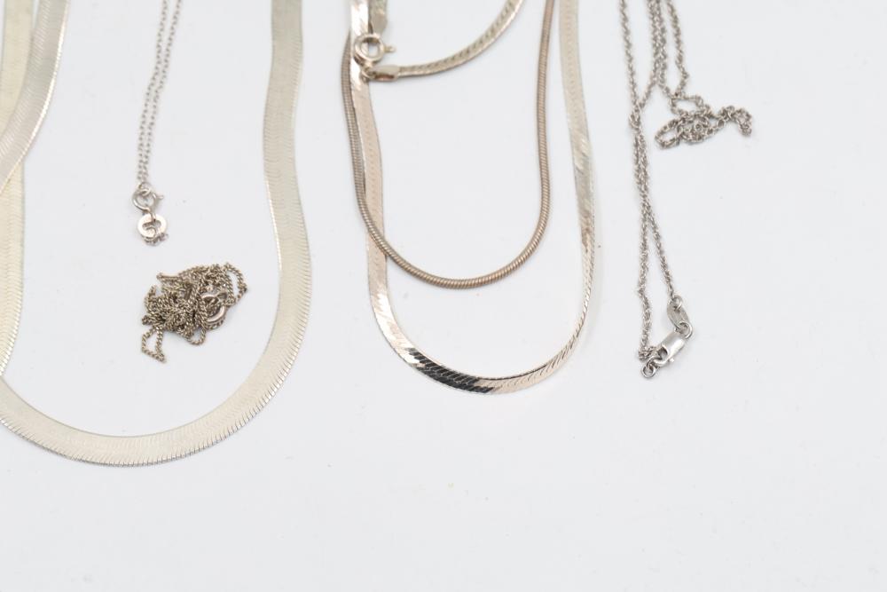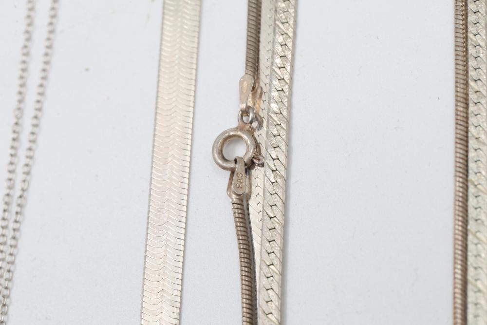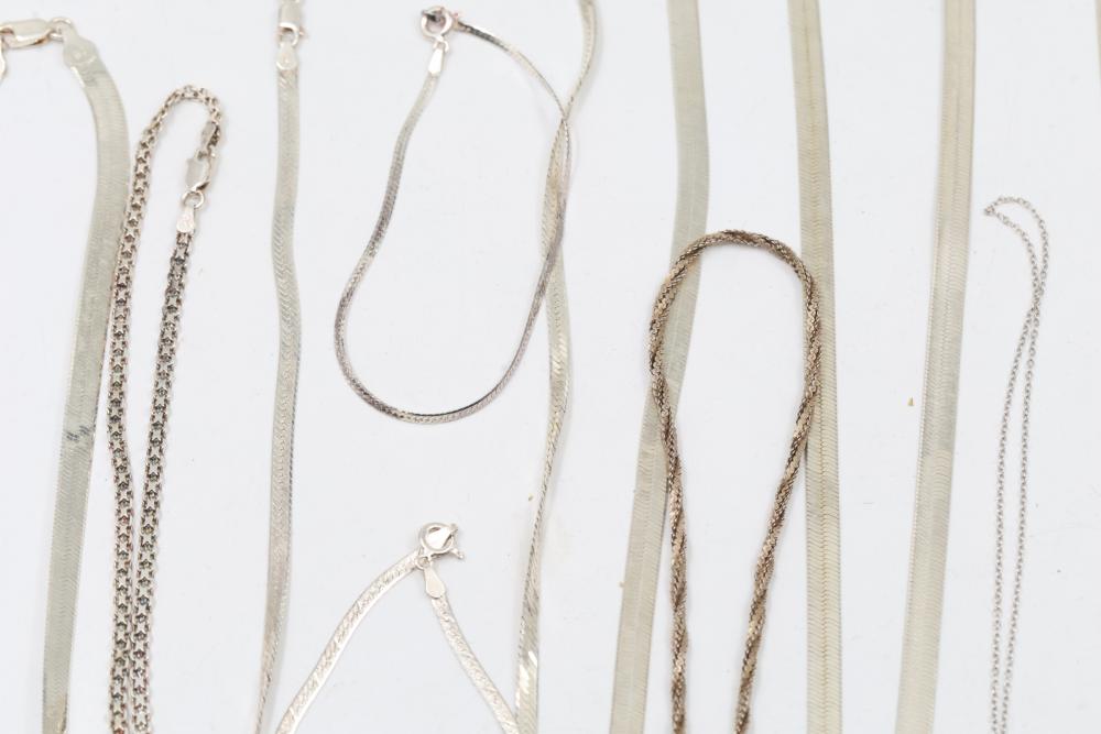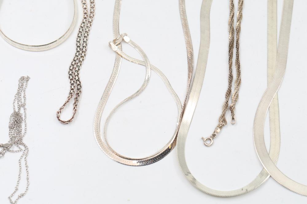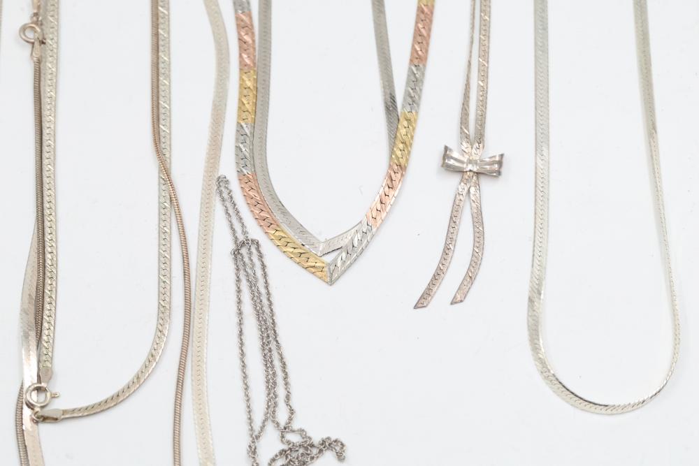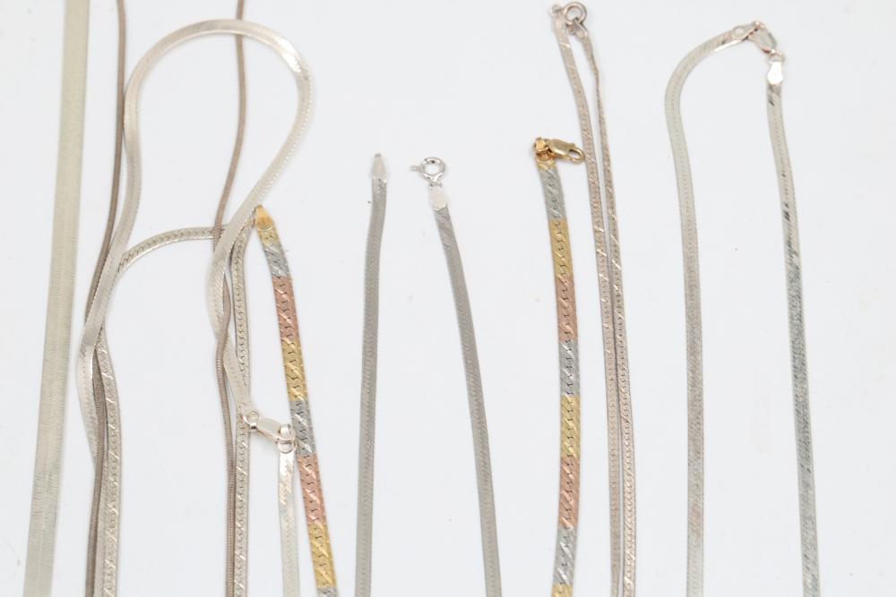 Sterling silver necklaces and chains with mixed designs, including polished and textured styles. Features elements like clasps and multi-tone accents. Variety includes straight and twisted chains with various lengths. Total silver weight being 213 grams.