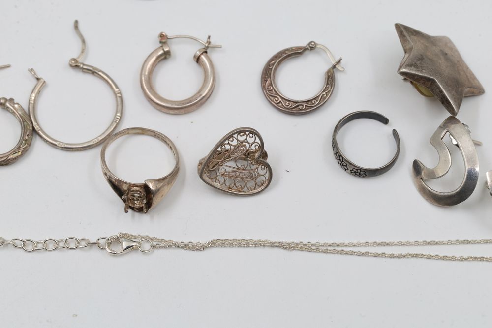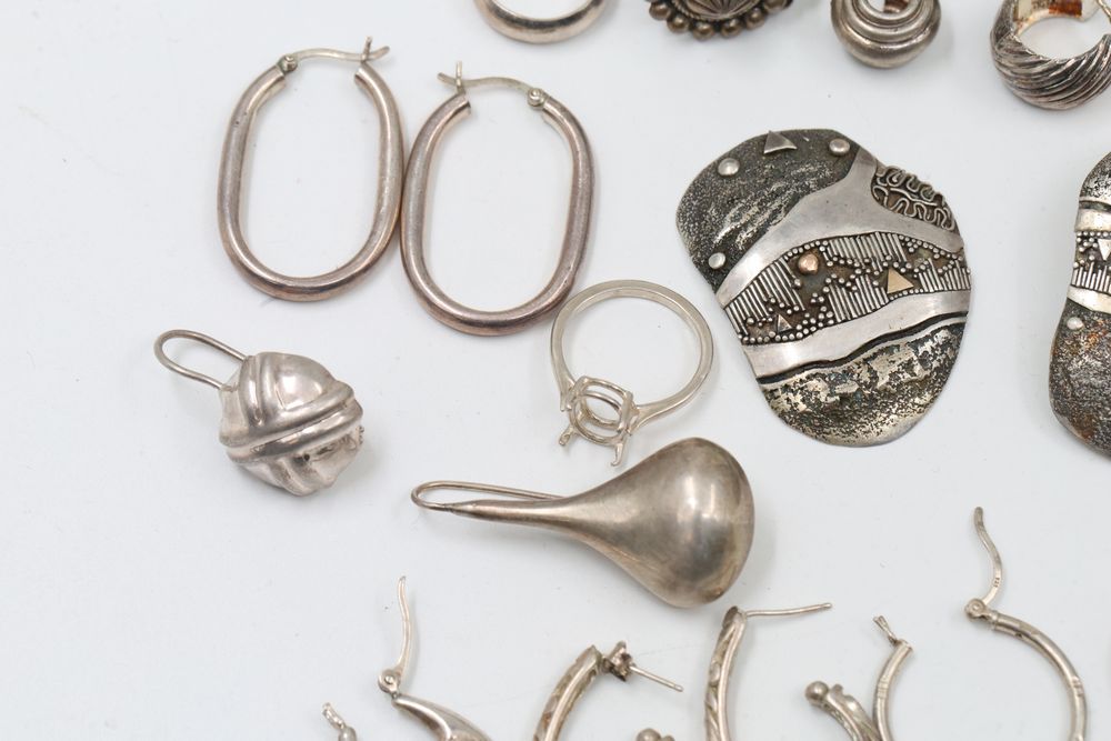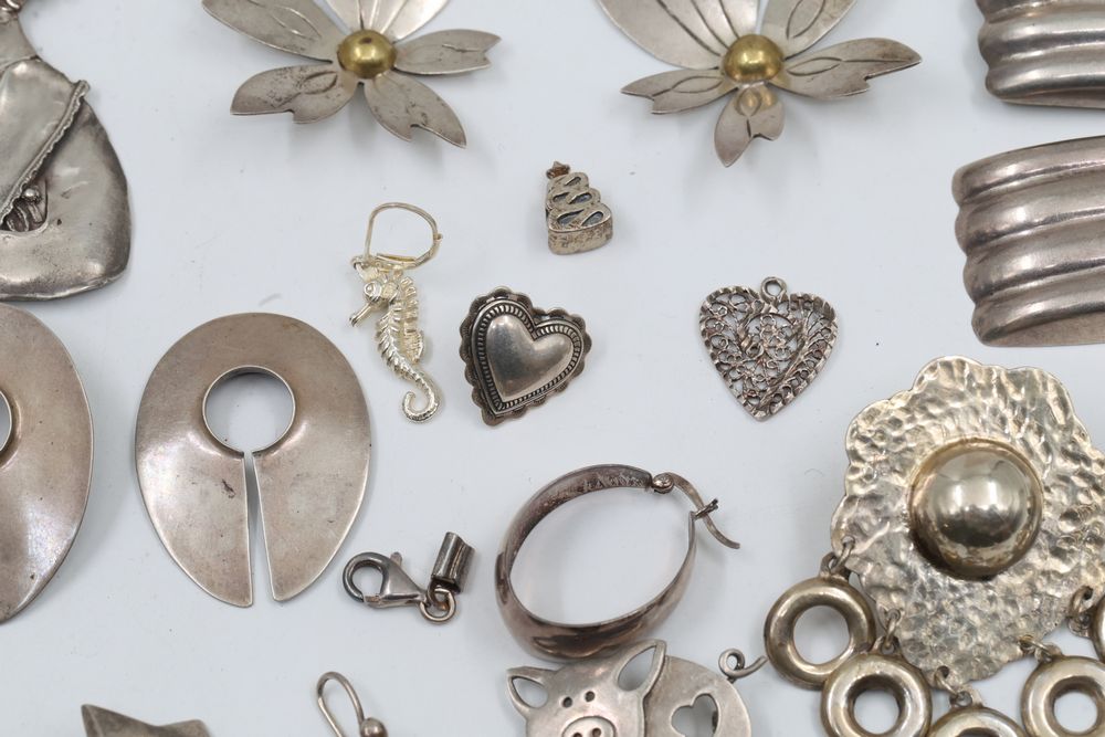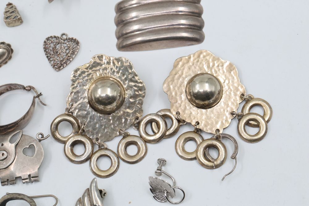Sterling silver jewelry including rings, hoop and drop earrings, brooches, pendants, bracelets, and necklaces. Designs feature animal motifs, abstract forms, filigree patterns, and sculptural elements. Some items marked "925" and "sterling". Total weight being 249 grams. Pickup only.