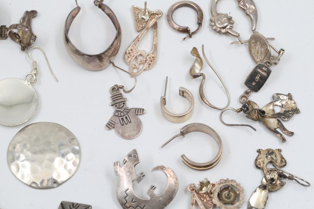 Silver and metal jewelry items including earrings, pendants, and charms. Various shapes and styles are included such as filigree designs, animal forms, abstract sculptures, and decorative motifs. Some items marked "925" and sterling. Silver weight being 184 grams. Total weight being 202 grams.