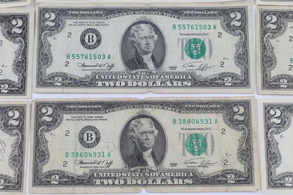 Ten United States $2 and One $5 bill includes multiple $2 notes and a single $5 note with varied series years and conditions. Reverse designs feature historical imagery such as the Signing of the Declaration of Independence.