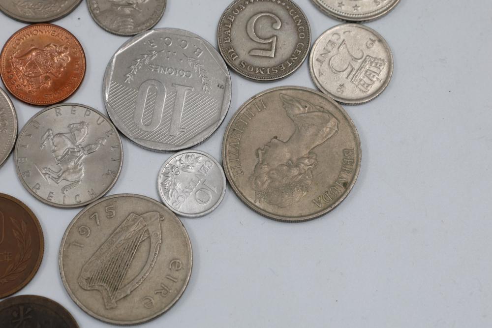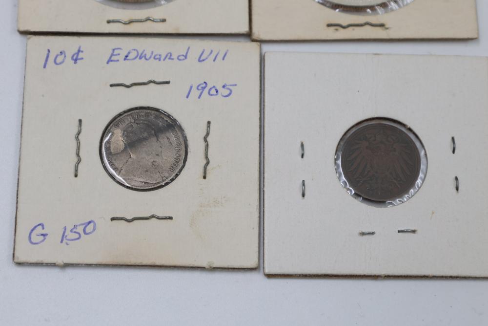 Worldwide coins and currency from various eras, including a mix of denominations, shapes, and sizes. Includes some coins in protective holders marked with dates and details, such as a 1905 Edward VII coin.