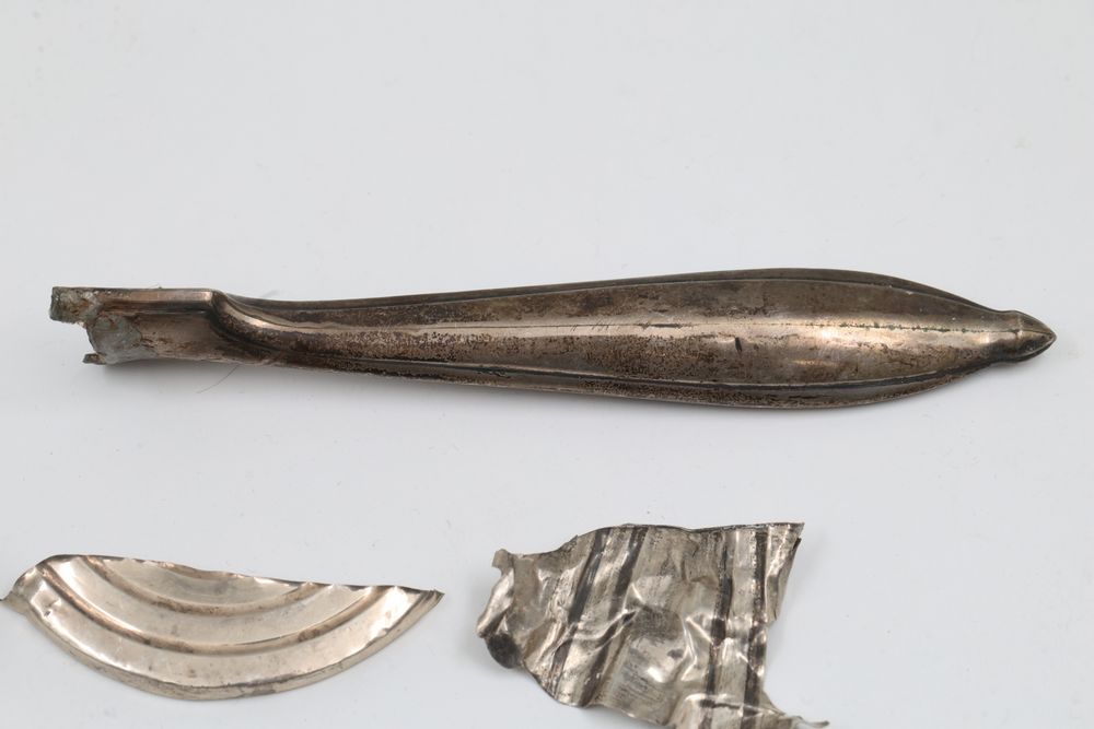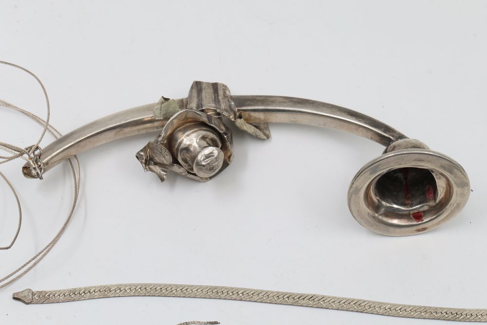 Silver metalwork fragments and chains consisting of various components, including intricately braided chains, shaped fragments, engraved pieces, and decorative details. Designs reflect both simple and ornate styles, with pieces displaying curved forms, fretwork, and engraving. Total weight being 151 grams.
