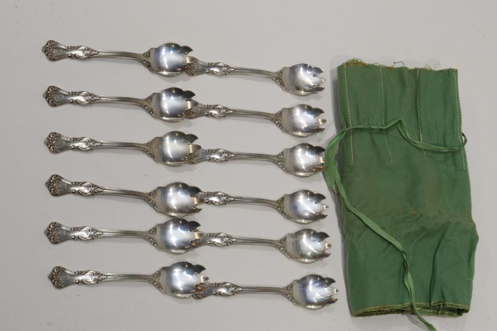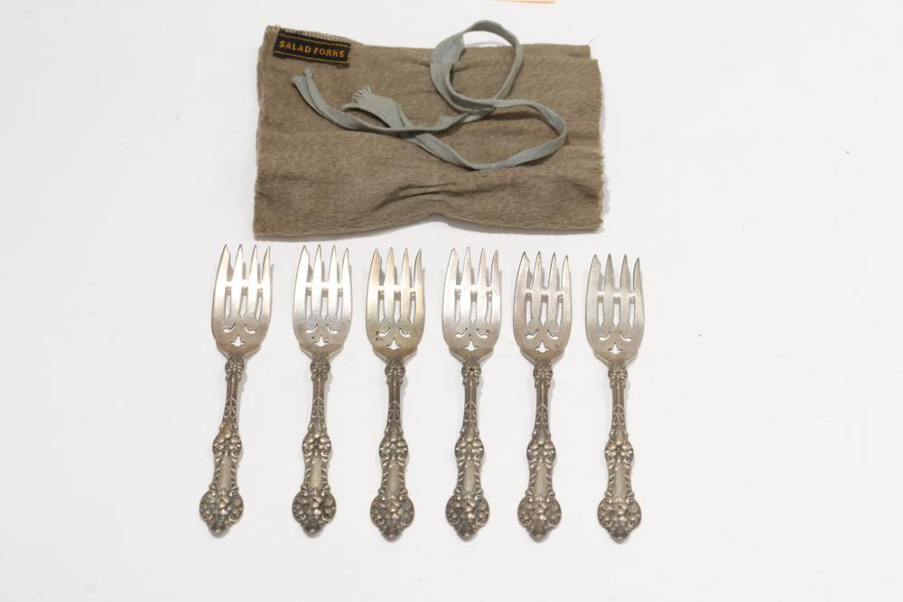 Six Wallace Sterling Silver Forks with Ornate Floral Design. Each fork features intricate floral motifs and cut-out patterns on the handle and the tine area. Stamped with the Wallace brand and 'Sterling.' These forks are ideal for formal dining settings or as a collectible. Total weight of 181 grams.
