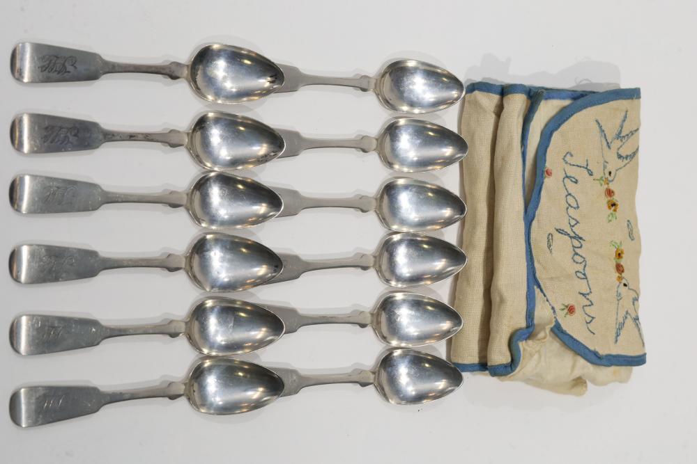 12 G.E. Butler coin silver spoons featuring engraved details and hallmarks on the handle. Each spoon has a monogram and is stamped with the maker's mark and other identifying hallmarks. Total weight being 256 grams.