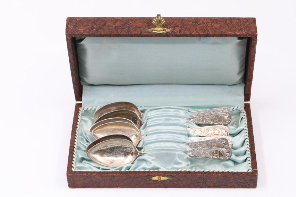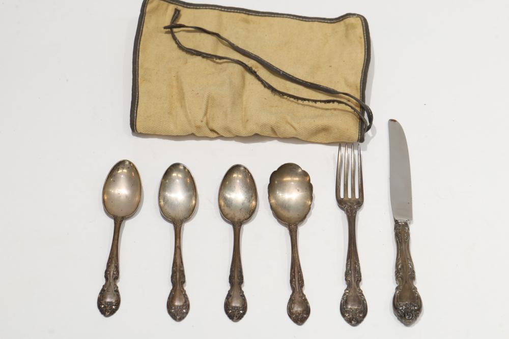 Sterling Silver Flatware including six spoons and six knives with ornate designs, and one serving spoon. Items feature intricate patterns and are marked with details, including '830S BR. Lohne' and 'Mastro A.G. Ohligs-Solingen Rustfrei.' The set includes a rolled storage case. Total weight of spoons being 241 grams, total weight of sterling handle knives being 491 grams.