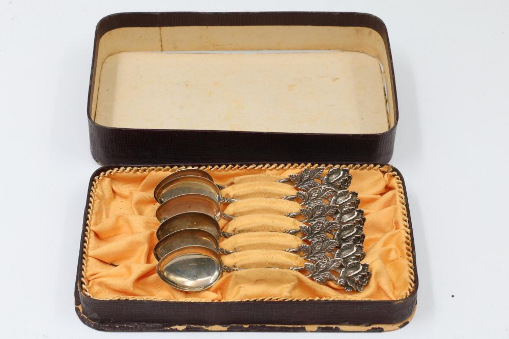 Six Rose-Handled Silver Spoons in Original Box. Each spoon features a twisted stem design with a rose and leaf motif on the handle. The spoons are stored in a lined box with a cushioned interior. The spoon is marked '835 CB'. Total weight being 65 grams. Tested with JSP Testing Solution.