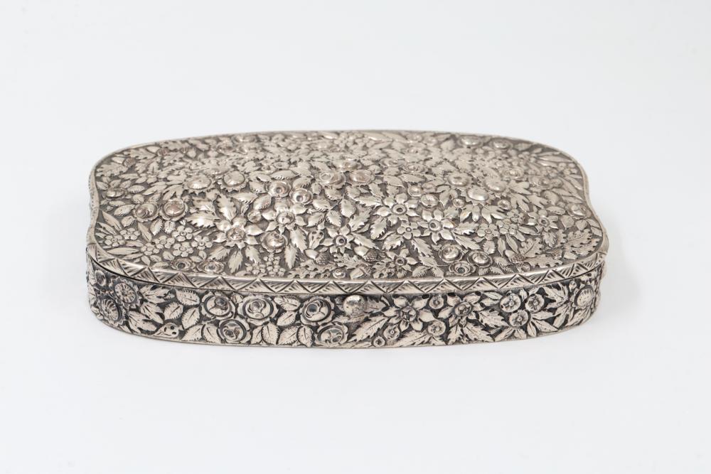Howard & Co Sterling Silver Hinged Box with Floral Design. This rectangular box is adorned with intricate floral and leaf patterns on all sides and features a hinged lid. The interior of the box has a smooth silver finish, and the underside is marked with 'Howard & Co' and 'Sterling.' Total weight being 312 grams.