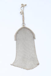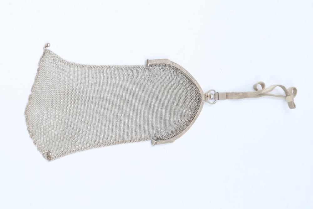 Sterling Silver Mesh Purse with Engraved Frame and Clasp. Features a delicate mesh construction with a detailed engraved frame and clasp. Includes an attached wrist strap. The interior has a personalized engraving. Marked 'Sterling' on the frame. Total weight being 94 grams.