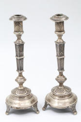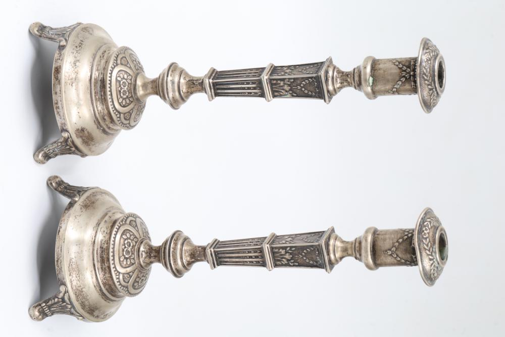Decorative Sterling Silver Candlesticks with Ornate Detailing. The candlesticks feature intricate patterns on the base and column, with decorative accents throughout. Each piece is supported by three small feet. Markings on the base include 'HF' and additional symbols. Total weight being 533 grams.