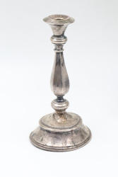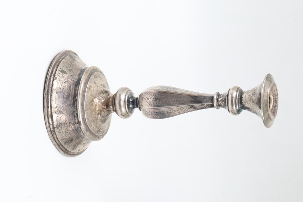Sterling Silver decorative candlestick holder with an engraved surface design. Features intricate geometric and floral patterns throughout the body, including detailed engravings on the base. It includes small hallmarks on the lower section of the base. Total weight being 341 grams.