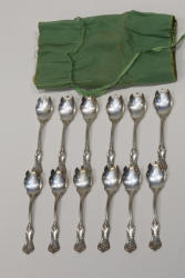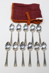 11 Sterling Silver Spoons with Monogram. Marked "Sterling" on the back of each handle. Features an engraved monogram on each spoon and comes in fabric storage wrap. Total weight being 221 grams.