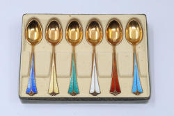 6 Sterling Silver and Enamel Demitasse Spoons featuring gold-washed bowls and handles with brightly colored enamel detailing in blue, green, yellow, white, light blue, and red. Each is marked 925S and Norway Sterling. Total weight being 59 grams.