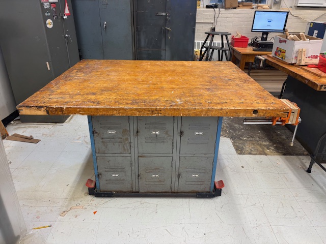 Maple top workbench, 2-inch thick, 64x64 inches. Height 34 inches, 2 sets of 6 lockers storage, Rolling base.