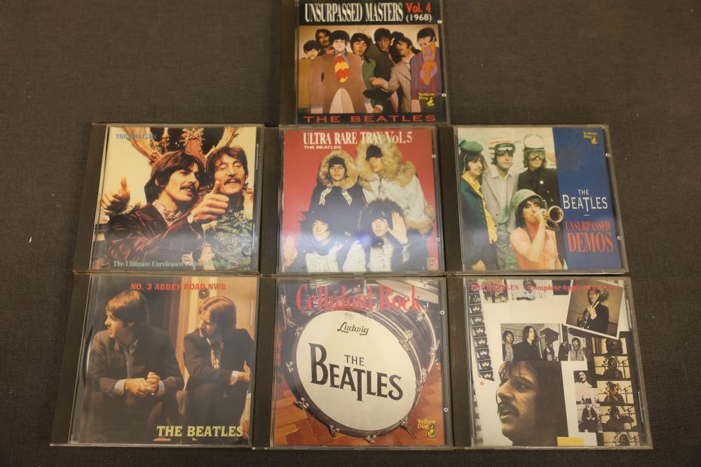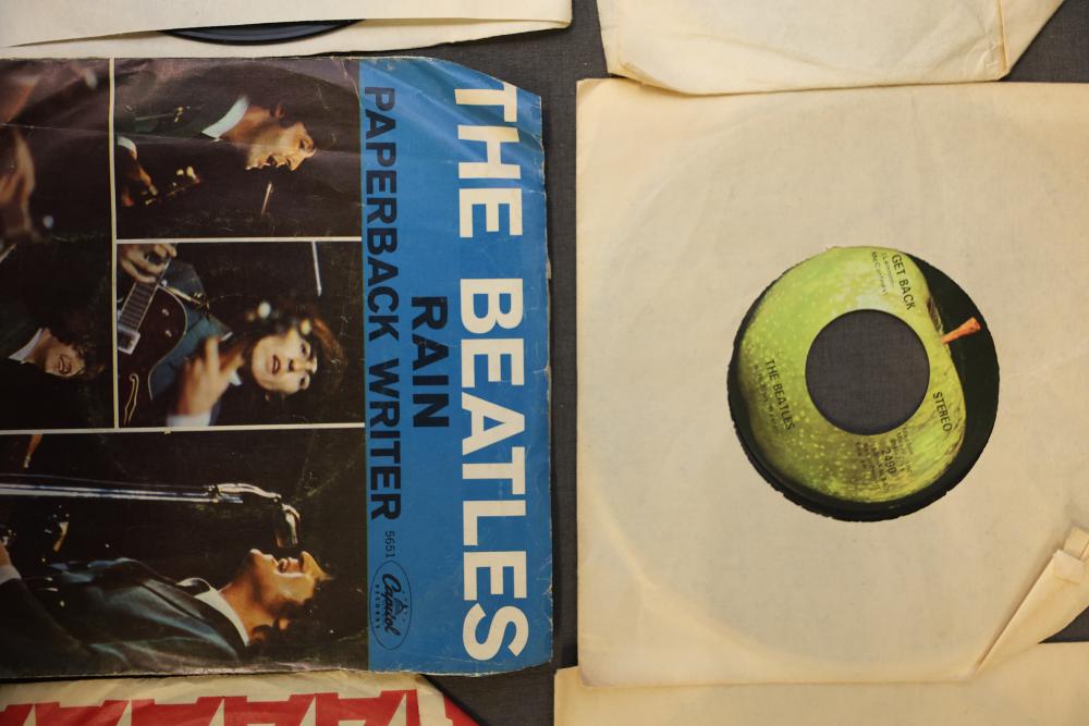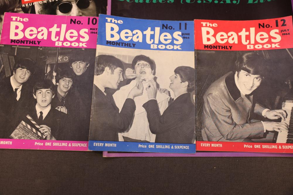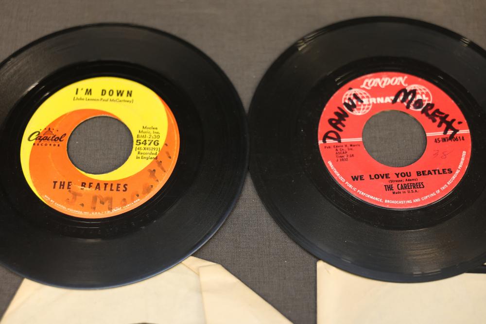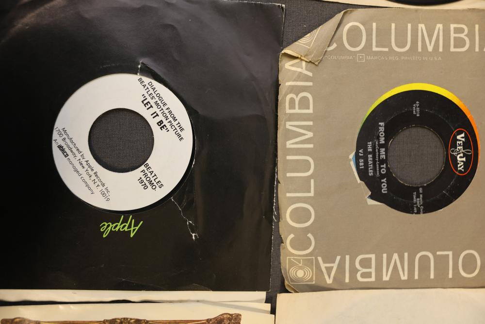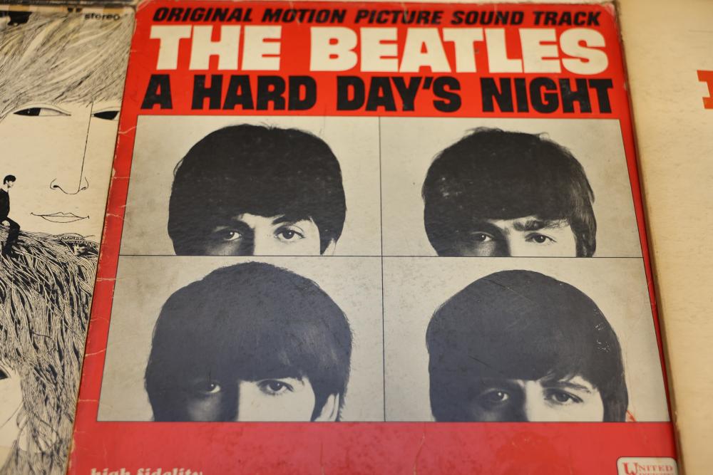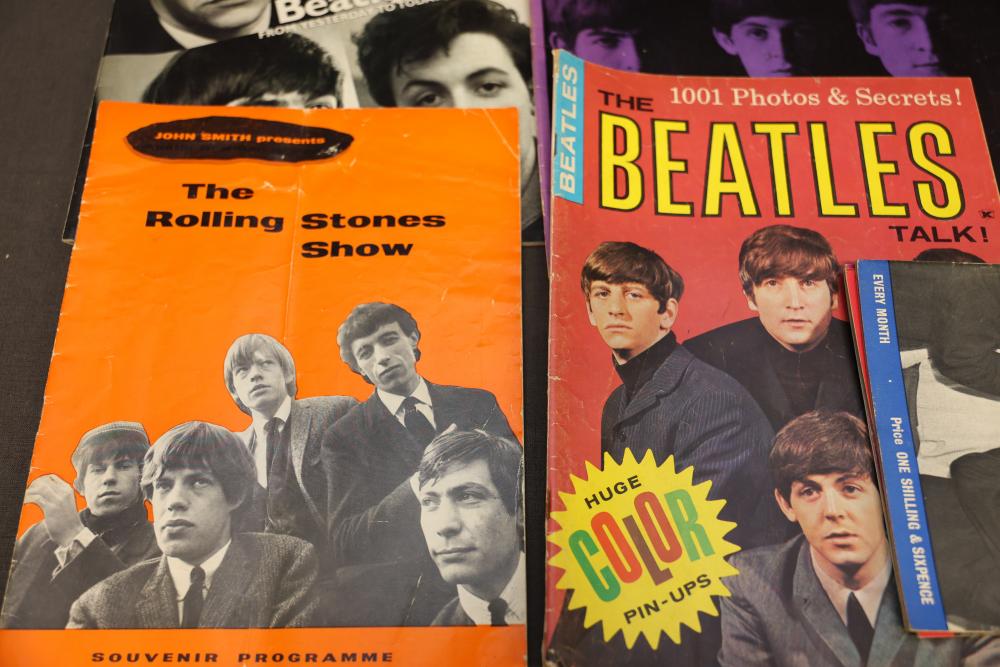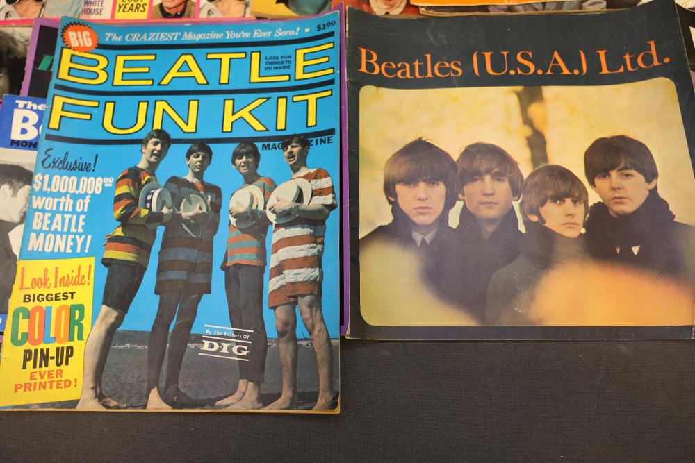 Beatles and Klaatu memorabilia, including signed Beatles posters, signed Klaatu promotional materials, vintage concert tickets, vinyl records, CDs, magazines, and related ephemera. Includes items from albums such as 'Revolver,' 'Help!,' 'A Hard Day's Night,' and more. Some items appear to be promotional or rare editions. Sold as a single offering. Pickup only.