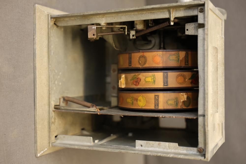Two Vintage Coin-Operated Machines: Puritan Gum Vendor and Red Slot Machine. The Puritan Gum Vendor features a mechanical lever, a fortune card panel, and spinning reels visible through a glass window. The Red Slot Machine includes a lever, coin slot, spinning reels, and payout chart. Both machines show age-related wear and functional components visible. Pickup only.